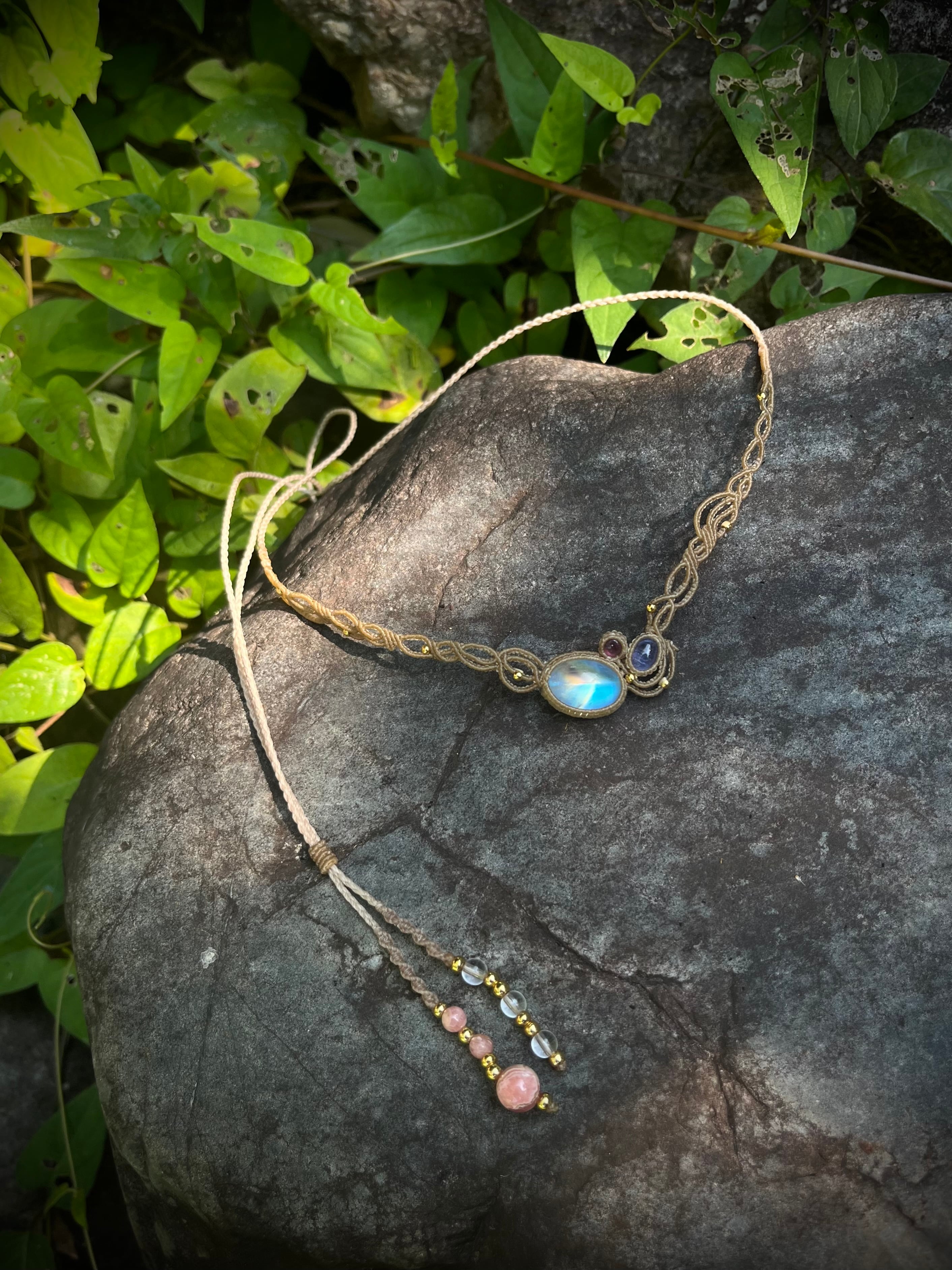 透明度が高く、レインボーのシラーが美しいムーンストーンに、ちぃさなピンクトルマリンと、タンザナイトを組み合わせました。