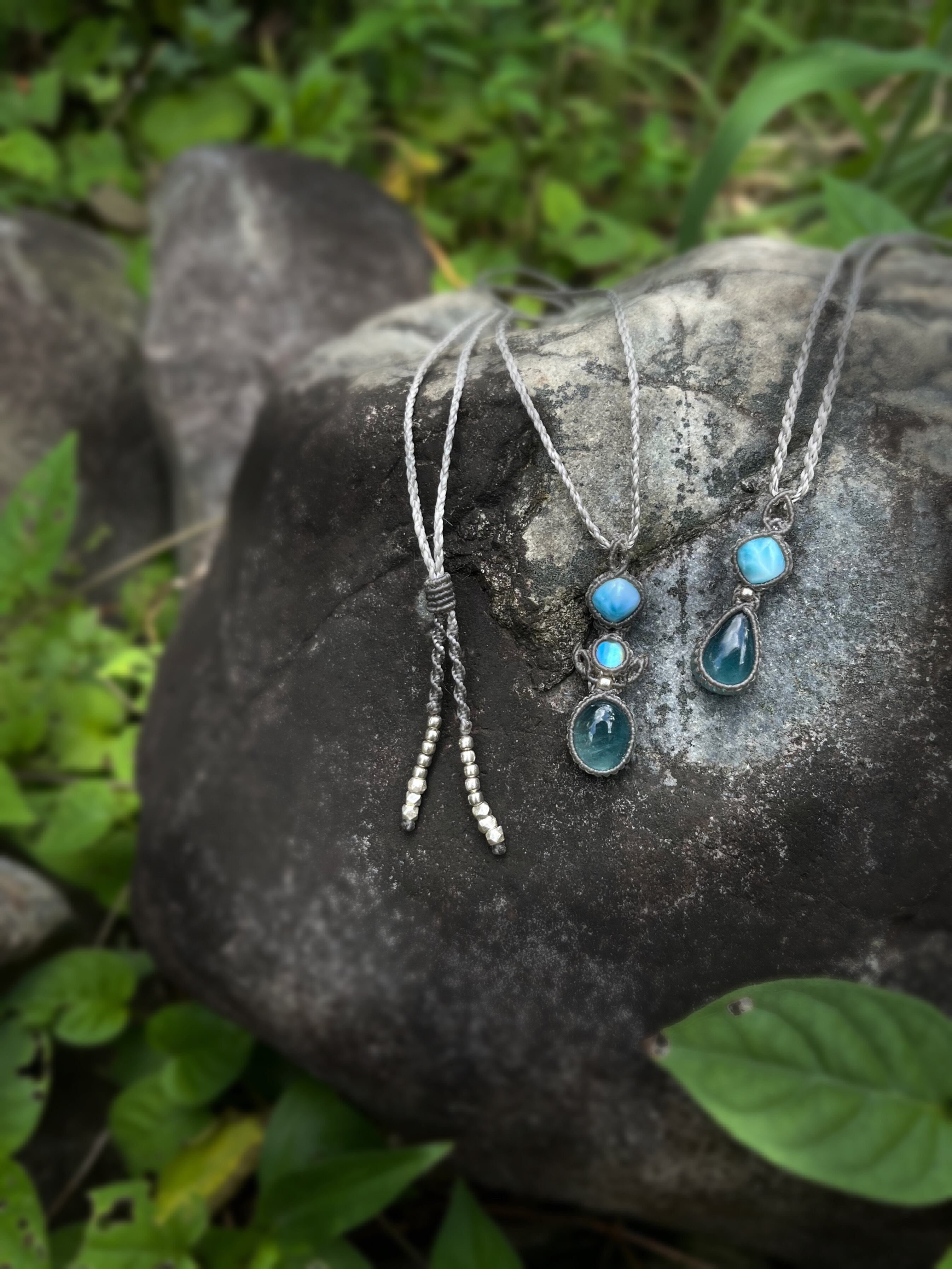 ラリマー、ムーンストーン、アパタイトの小粒を繋げたバランスの良いwingデザインペンダント。