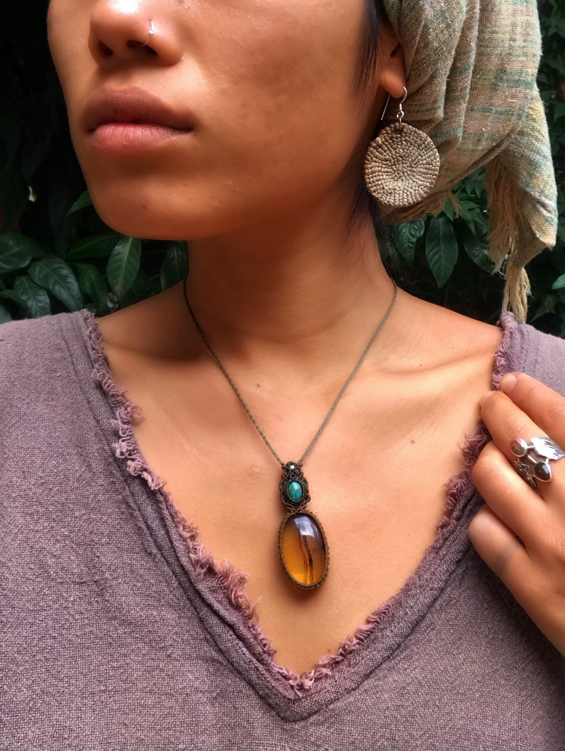 メキシコ産琥珀(アンバー)と、クリソコラのマクラメデザインペンダント☆
