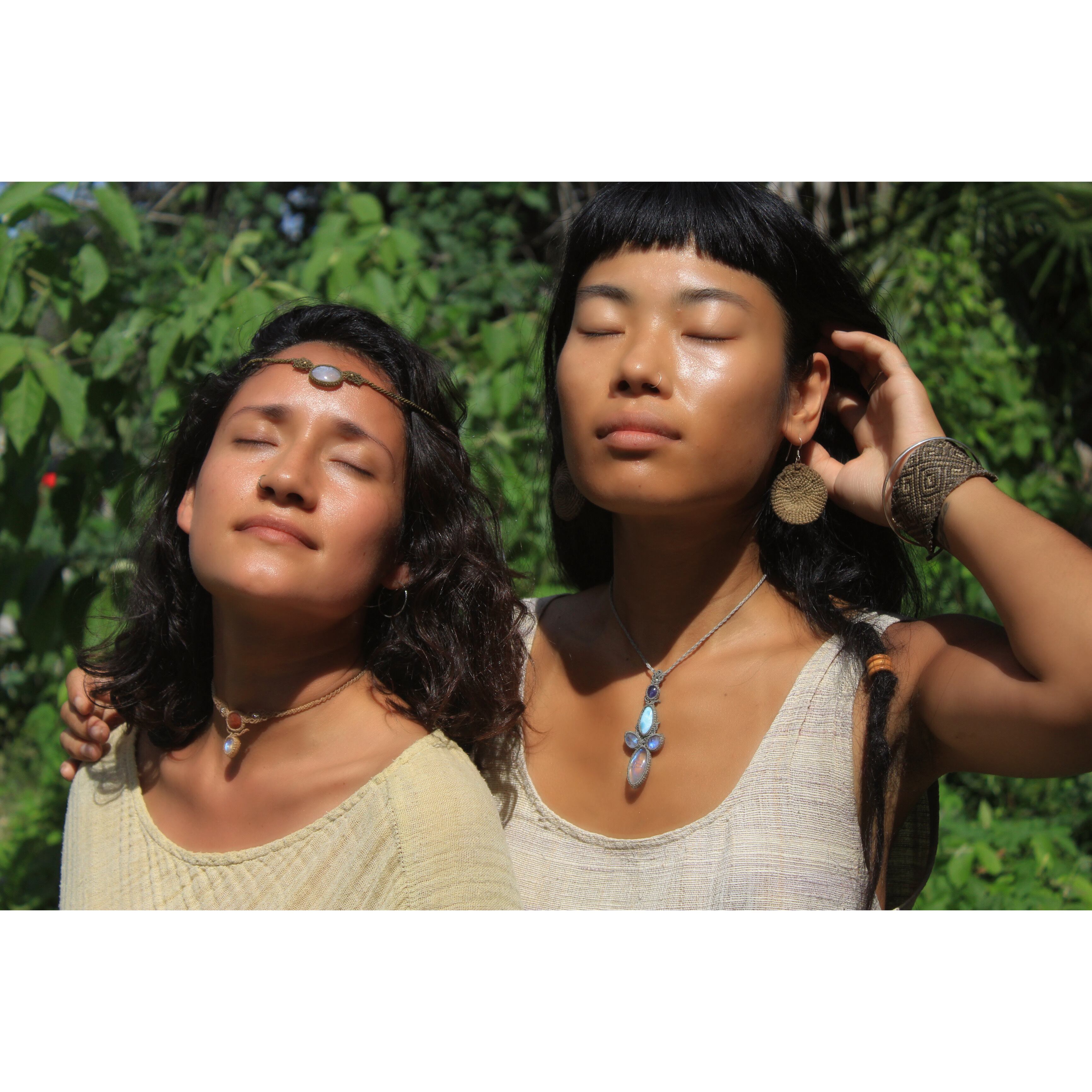 首元でレインボーに輝くムーンストーンがとても美しいです⭐︎ 季節問わず使って頂けるデザイン、色合いとなっております。