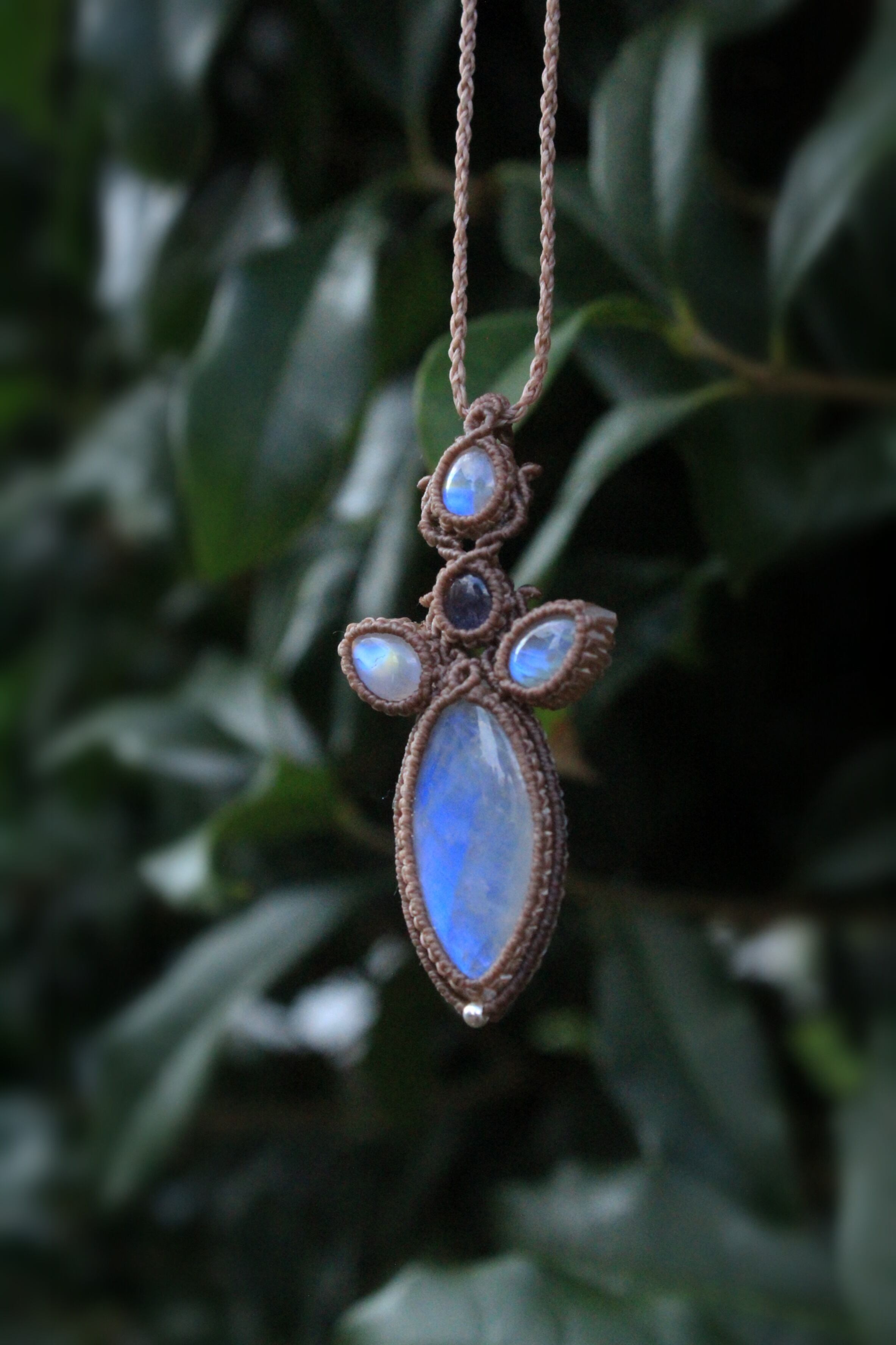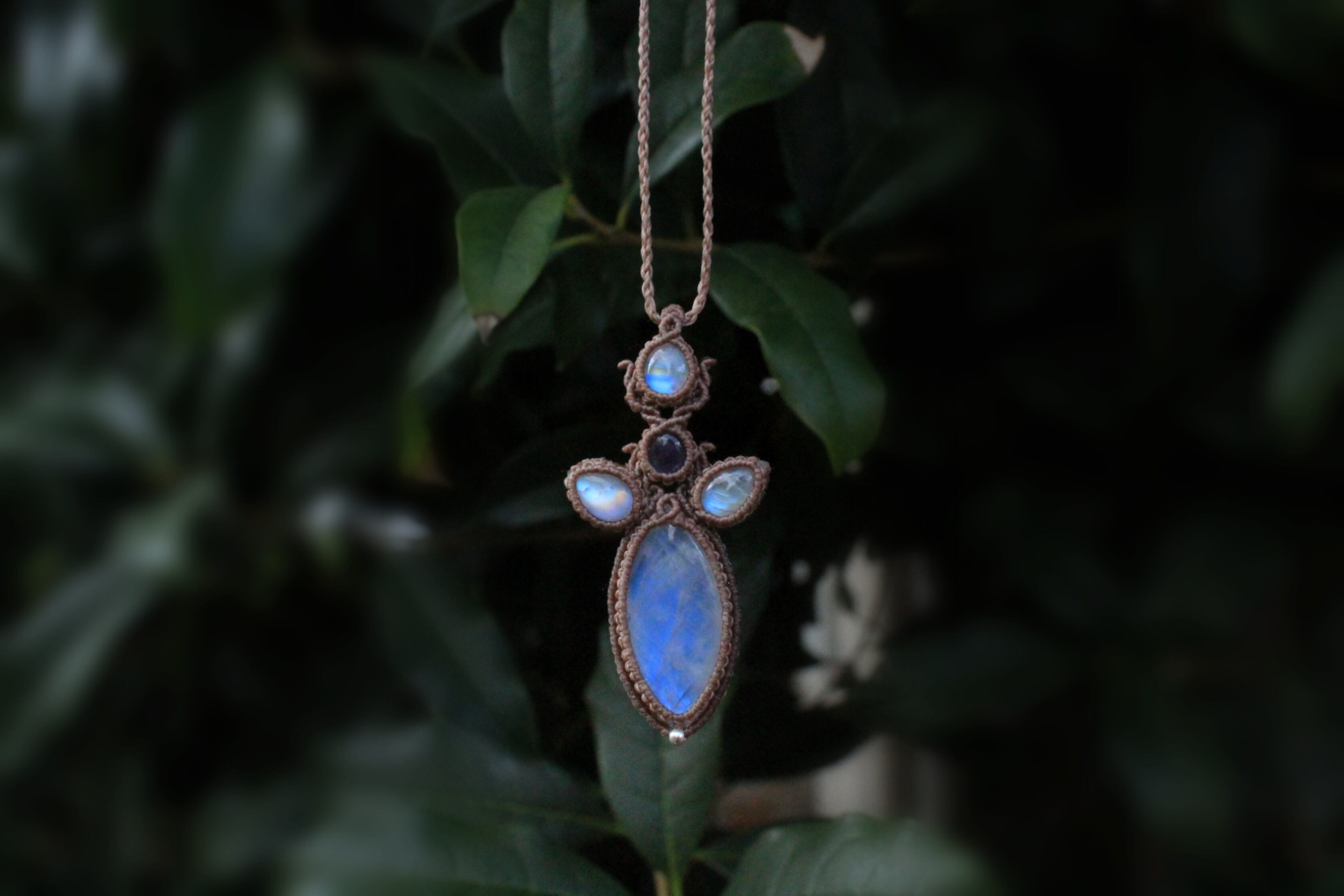 レインボームーンストーンを4つと真ん中にタンザナイトをあしらった贅沢なペンダント。