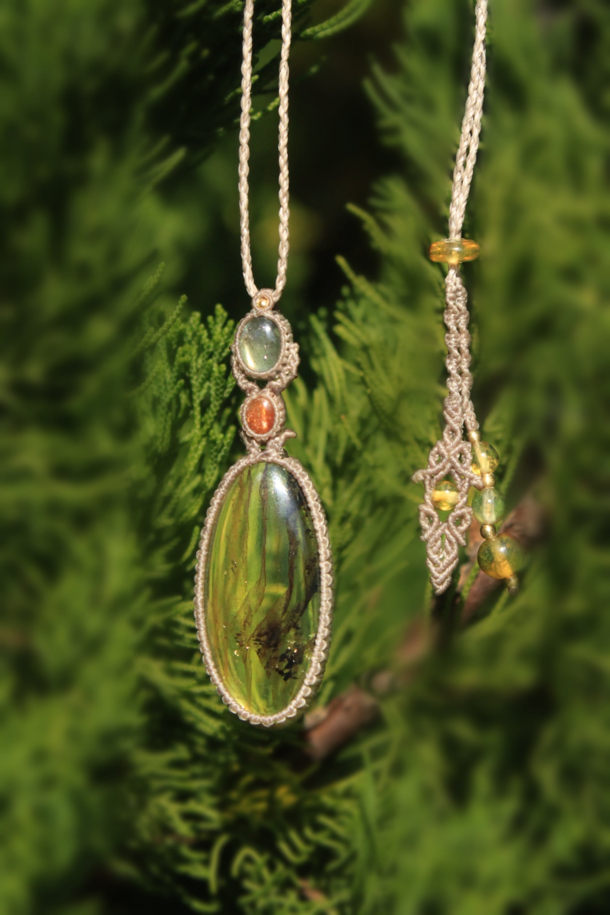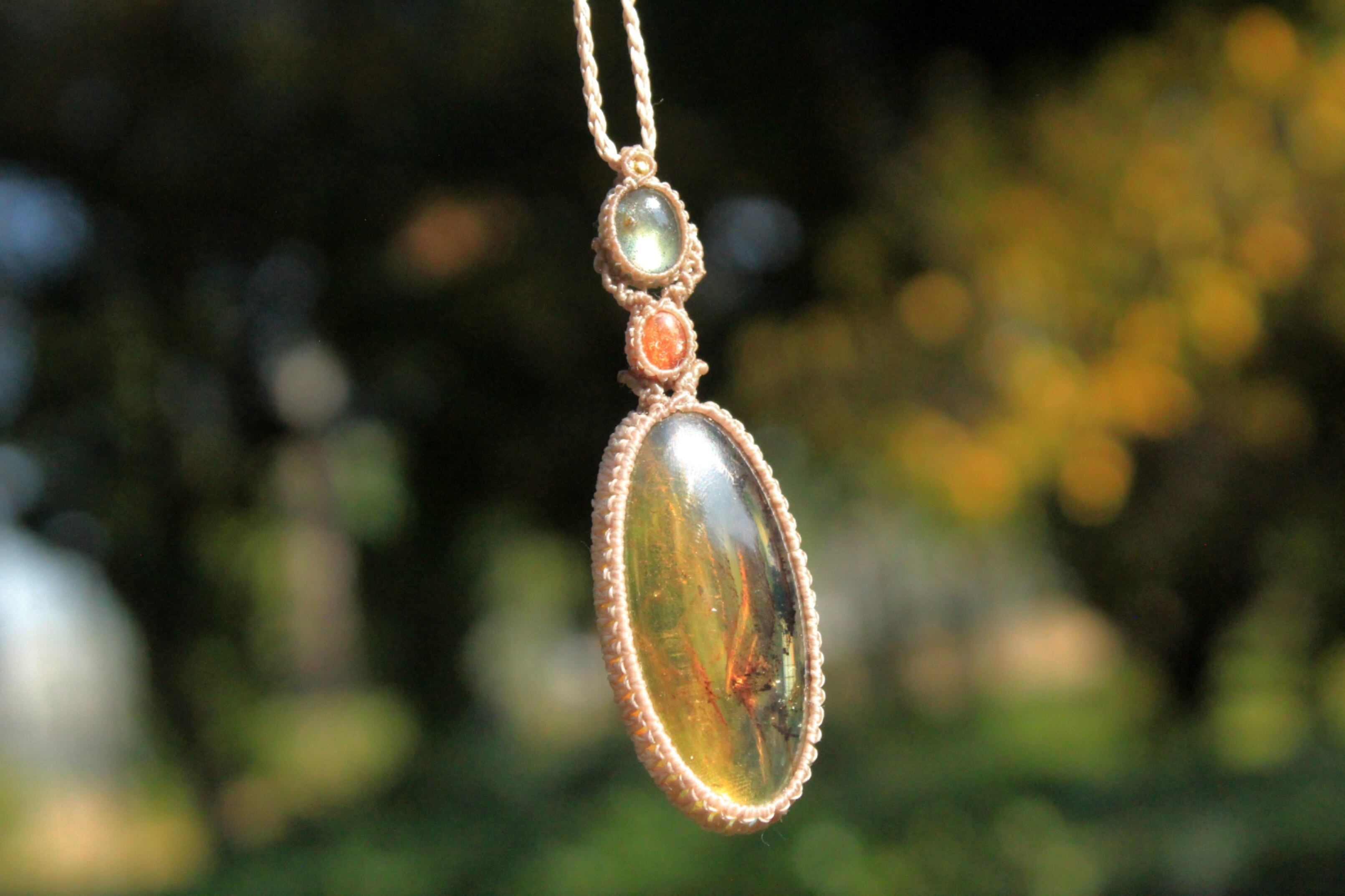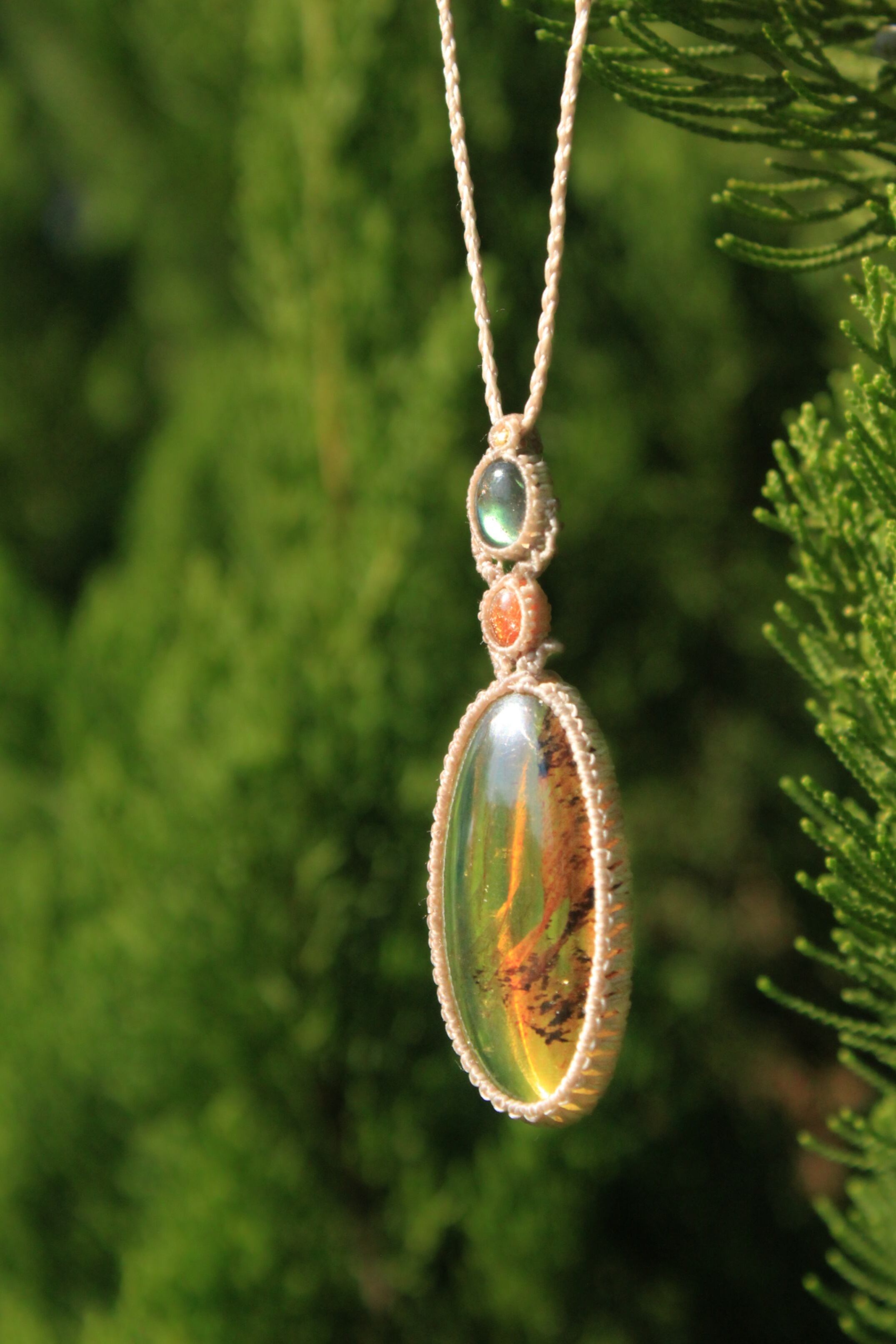 メキシコ滞在時に産地にて仕入れた美しいアンバー(琥珀)と、サンストーン、ラブラドライトを組み合わせたシンプルなペンダント。