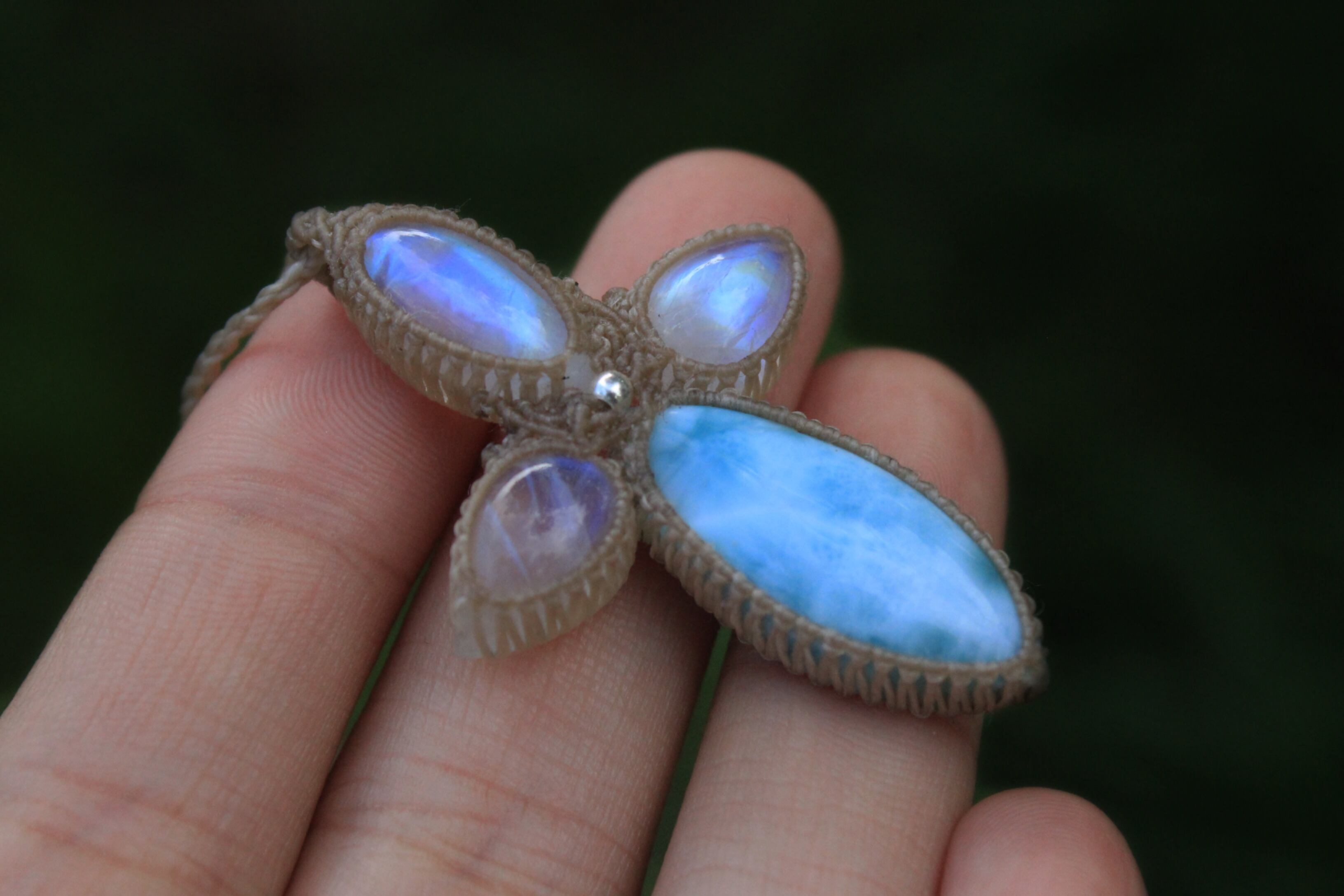 3つのレインボームーンストーンとラリマーを合わせた神秘的な輝きを持つペンダント。