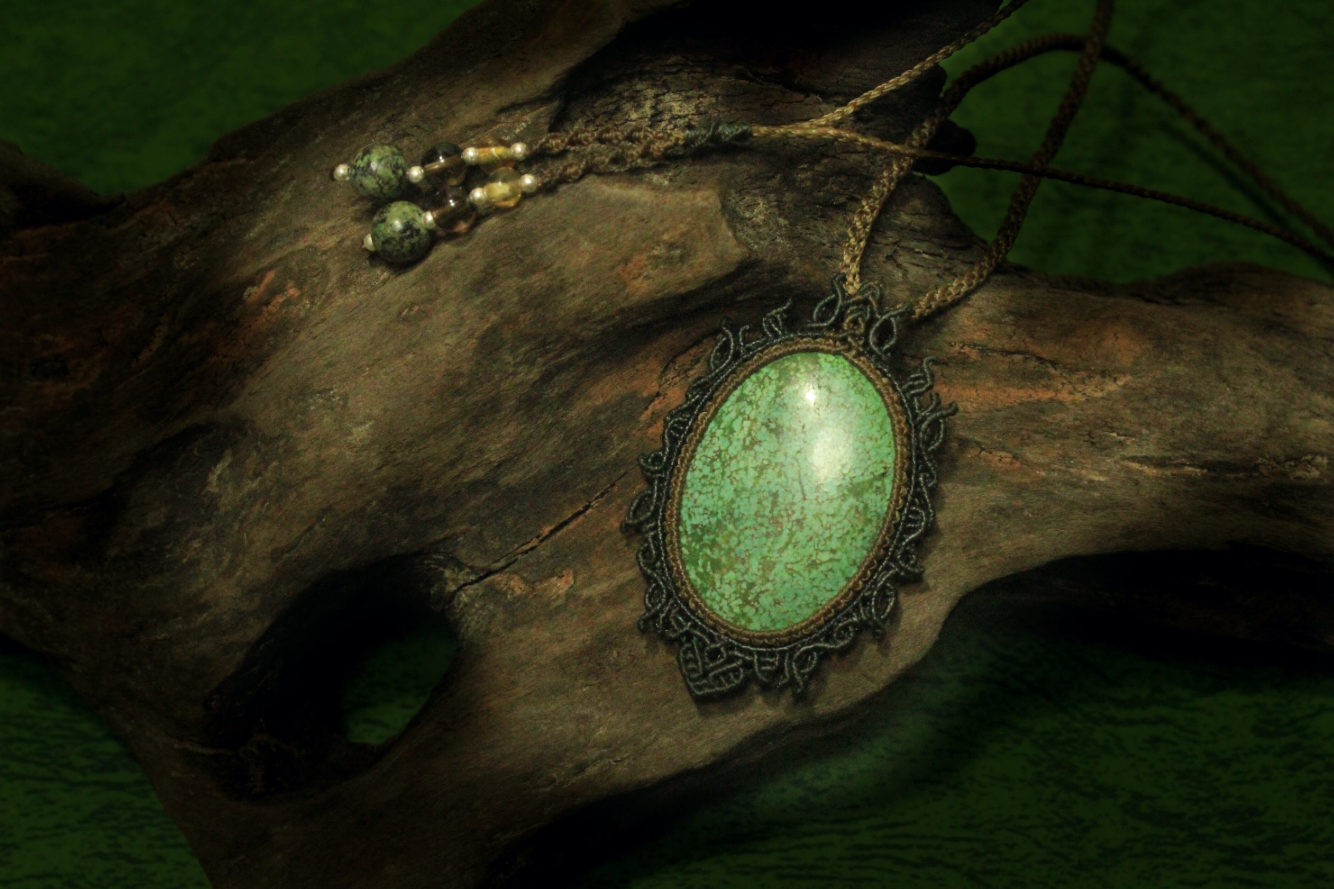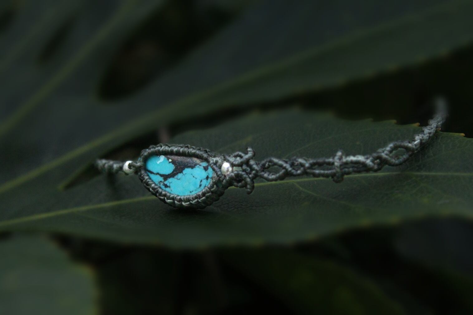 ターコイズブルーが美しく、アースカラーのワックスコードで編み上げました。