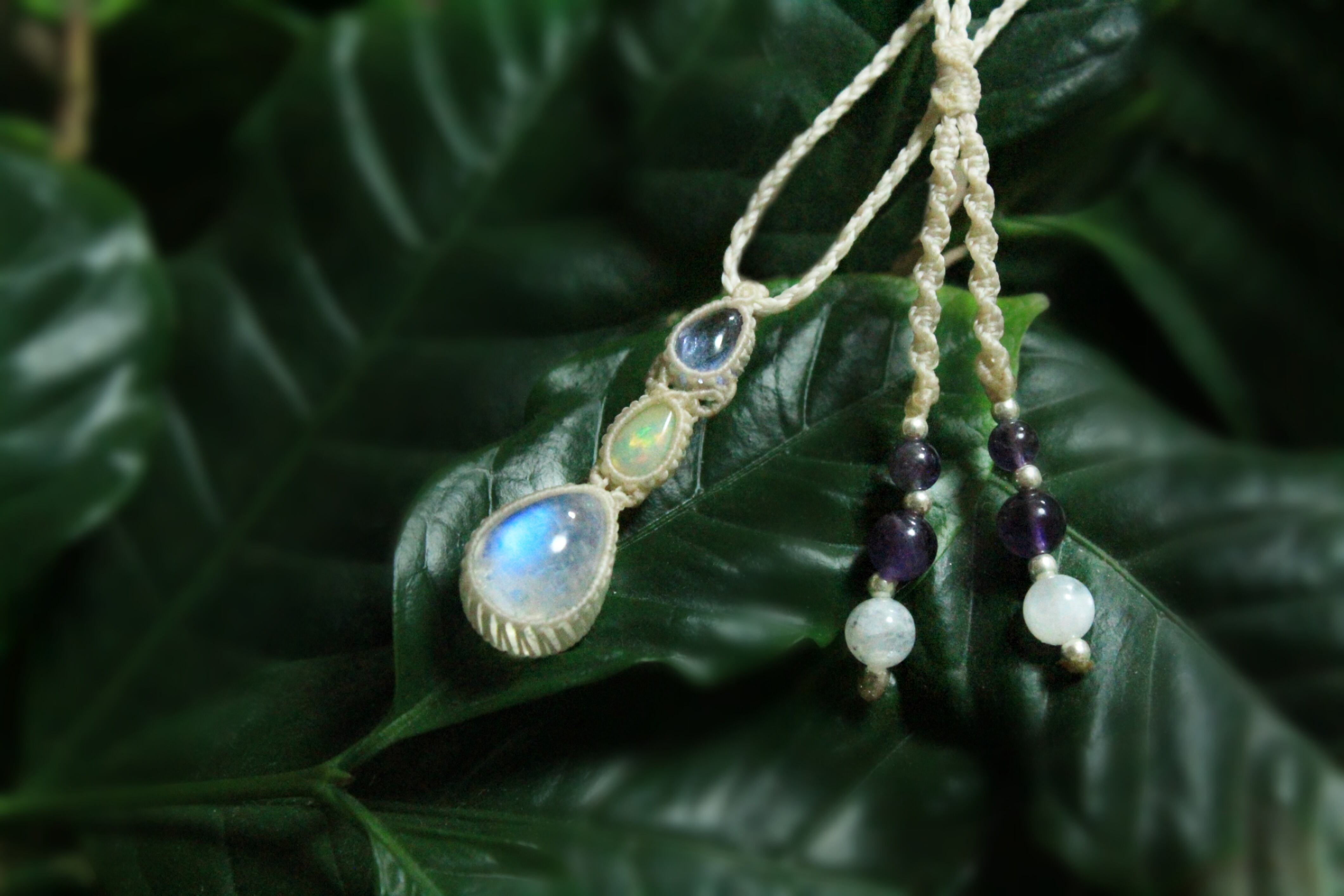 透明感の高いタンザナイトと、キラキラと優しい光に包まれたエチオピア産オパールにぷっくらと透明感のあるブルームーンストーンを組み合わせました。