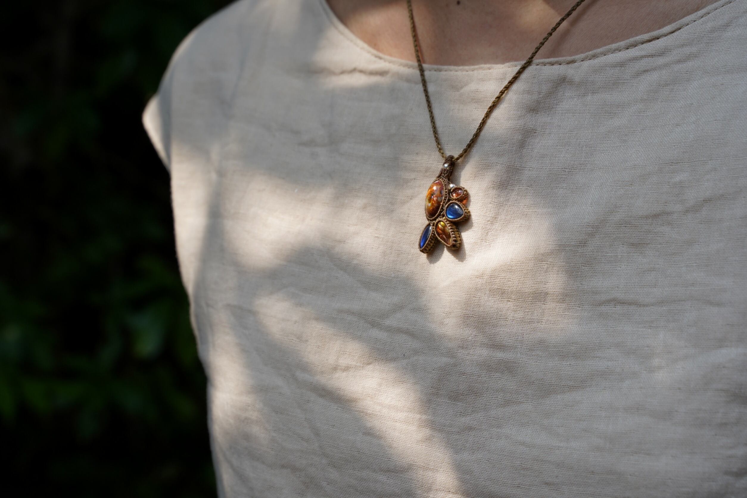 メキシコ産カンテラオパールをメインに、サンストーン、ラブラドライトを2つとメキシコ産ファイヤーアゲートをバランス良く散りばめたデザインペンダント。