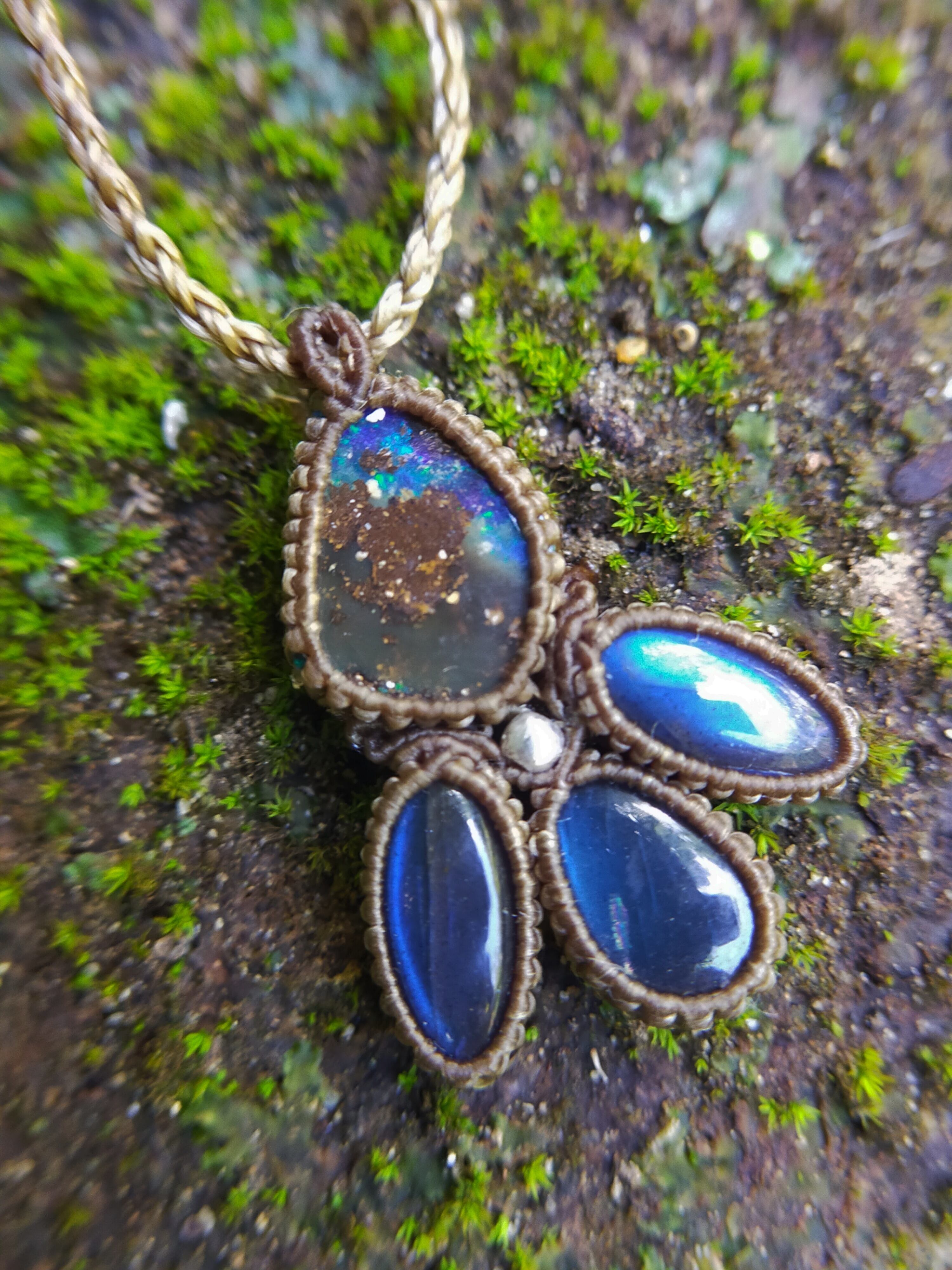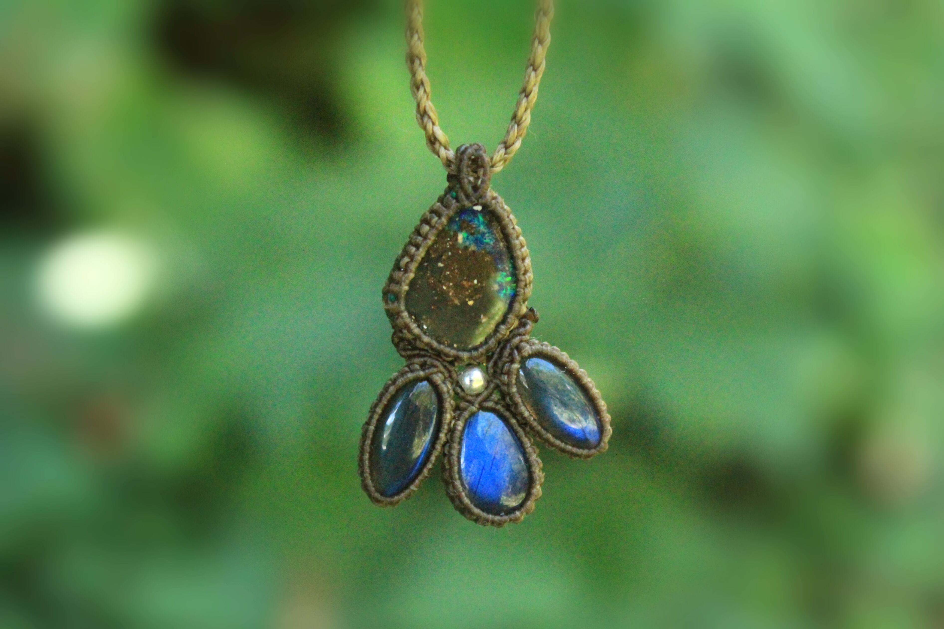 力強い遊色を見せてくれるオーストラリア産ボルダーオパールと、深いブルーのシラーが美しいラブラドライトを組み合わせた豪華なペンダントトップ。