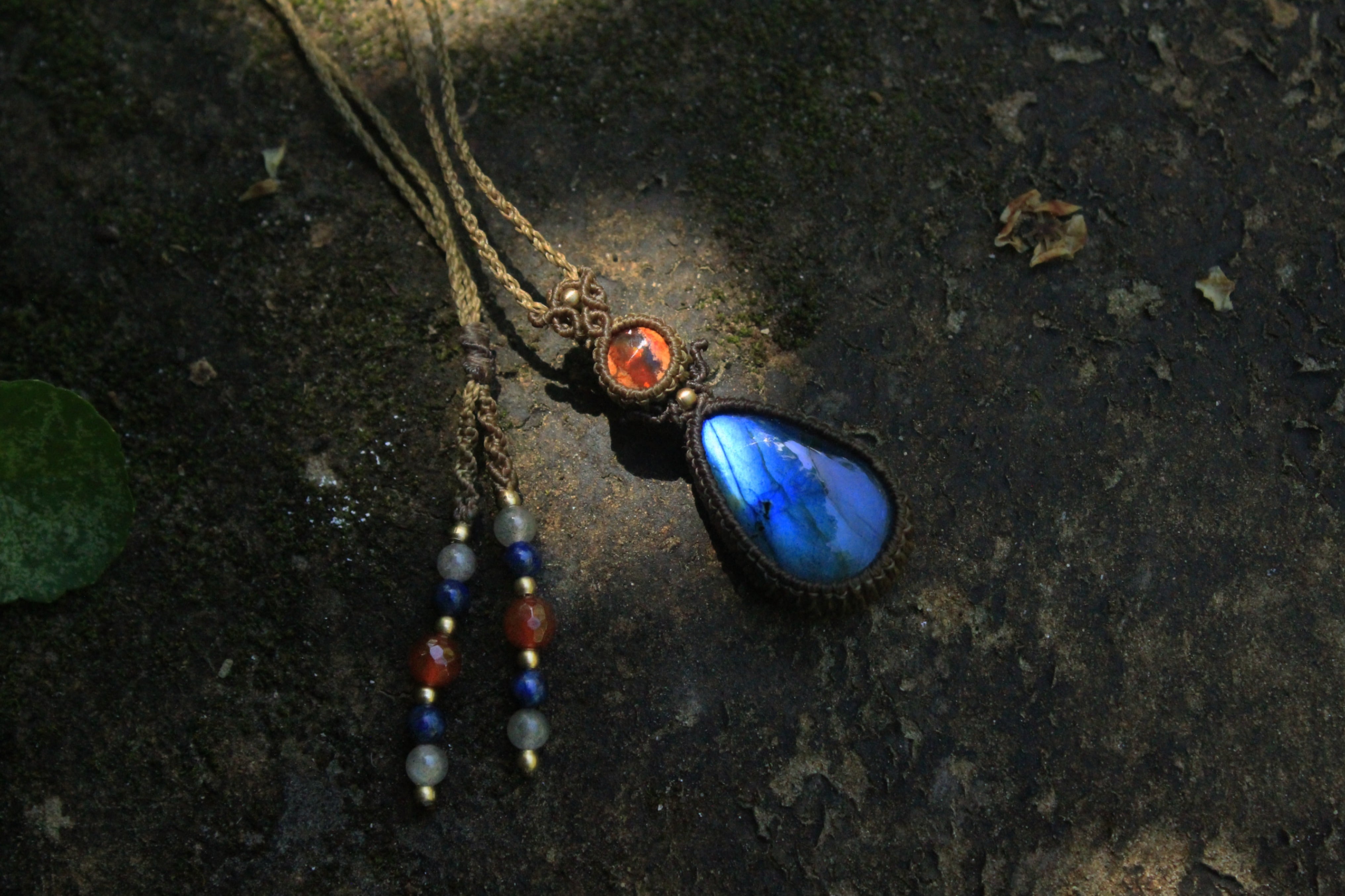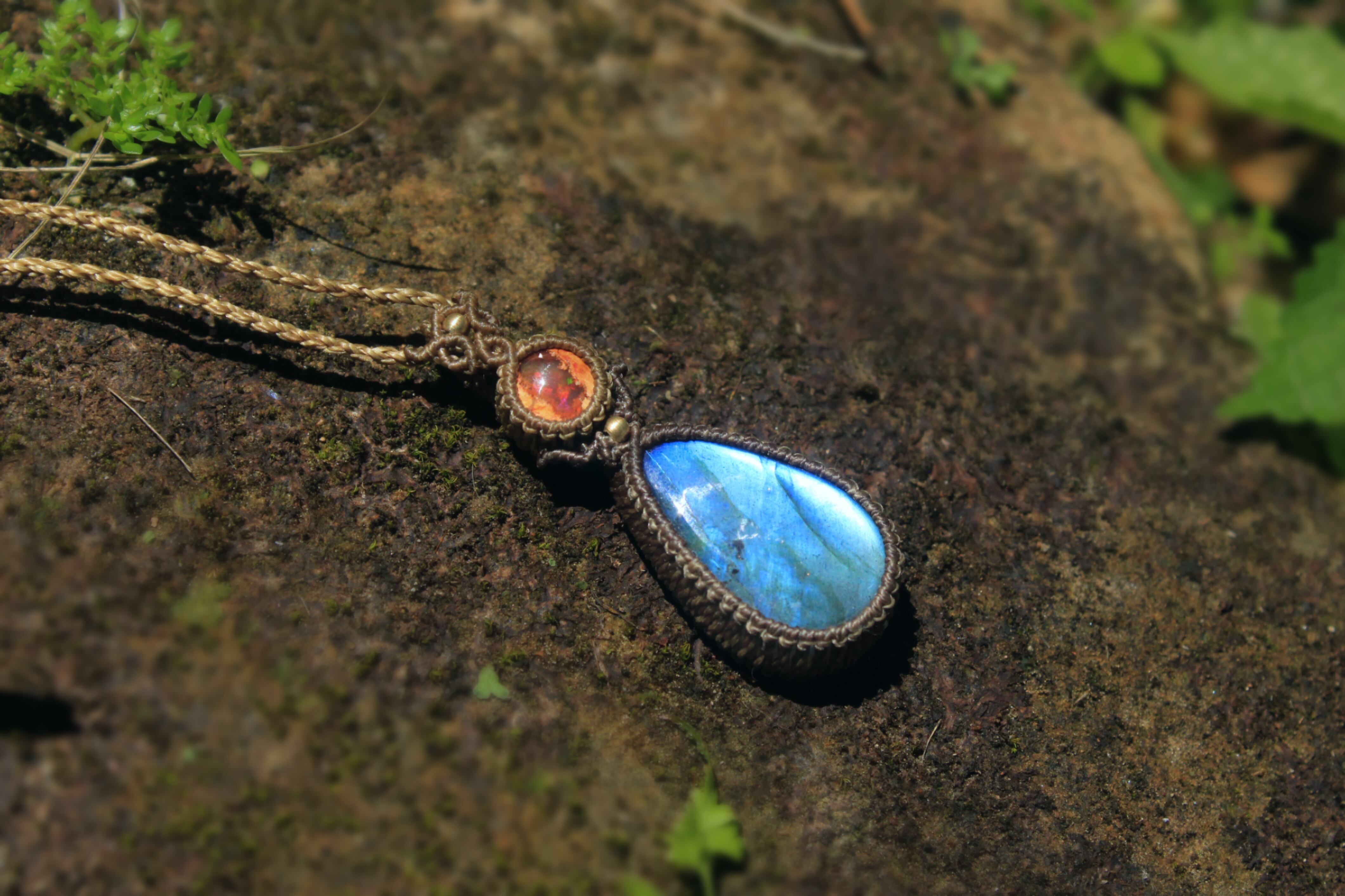 メキシコ産カンテラオパールと、優しいブルーのシラーが美しいラブラドライトを組み合わせたペンダント。