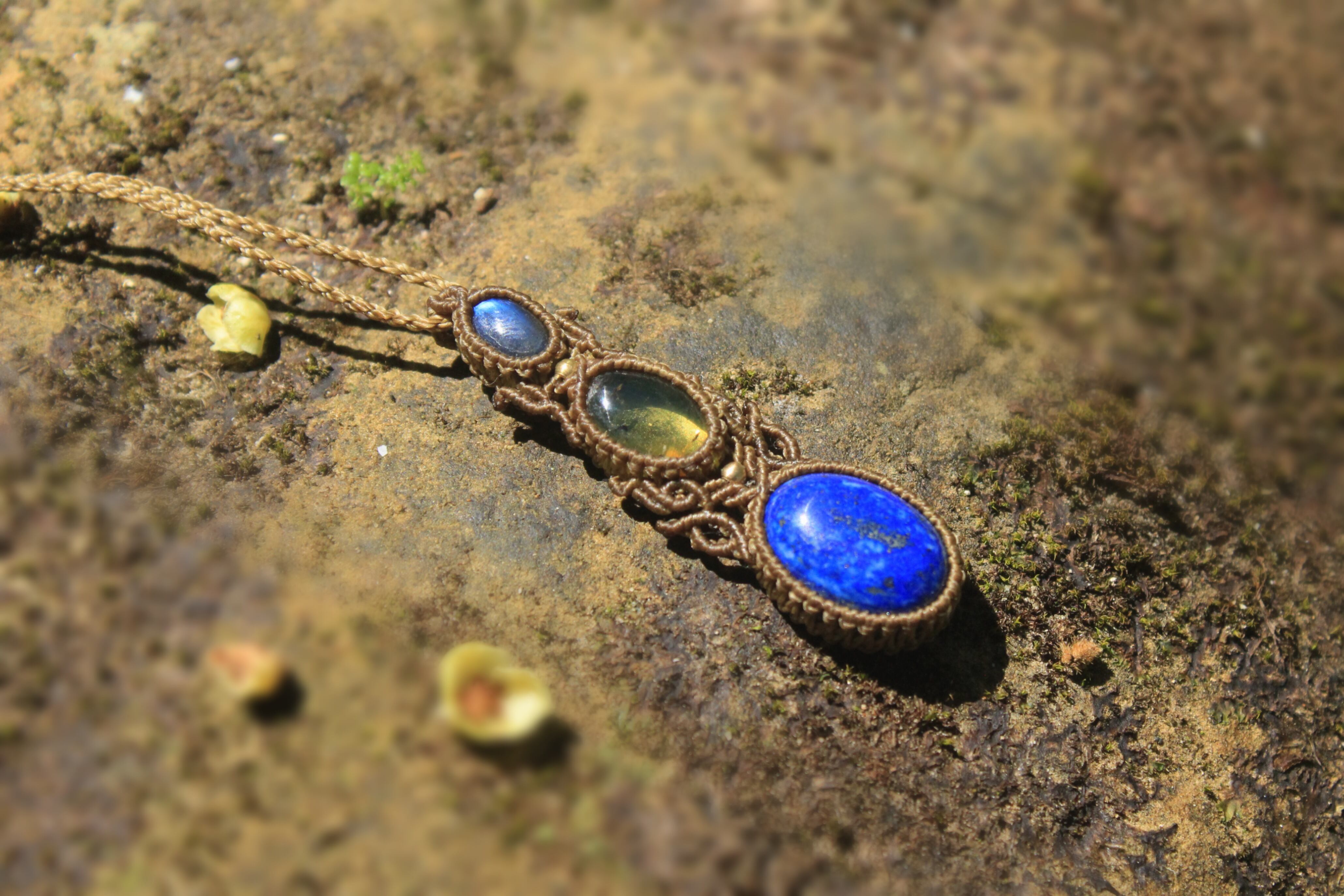 深いブルーのラブラドライトとラピスラズリの間に挟まれた、輝くように美しいアンバー(琥珀)は、去年メキシコ滞在時に現地にて直接仕入れた、自然のエネルギーたっぷりのルースです。
