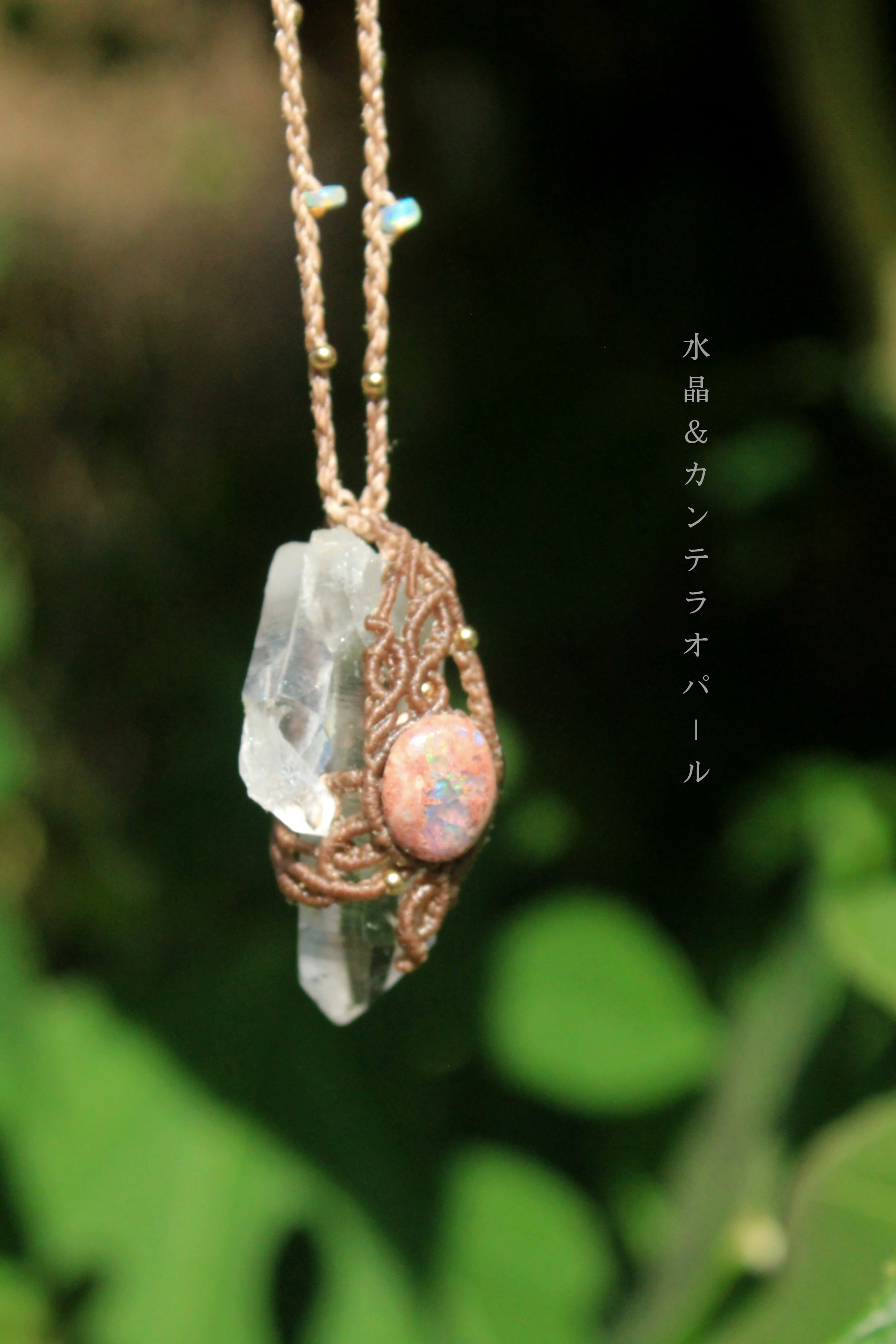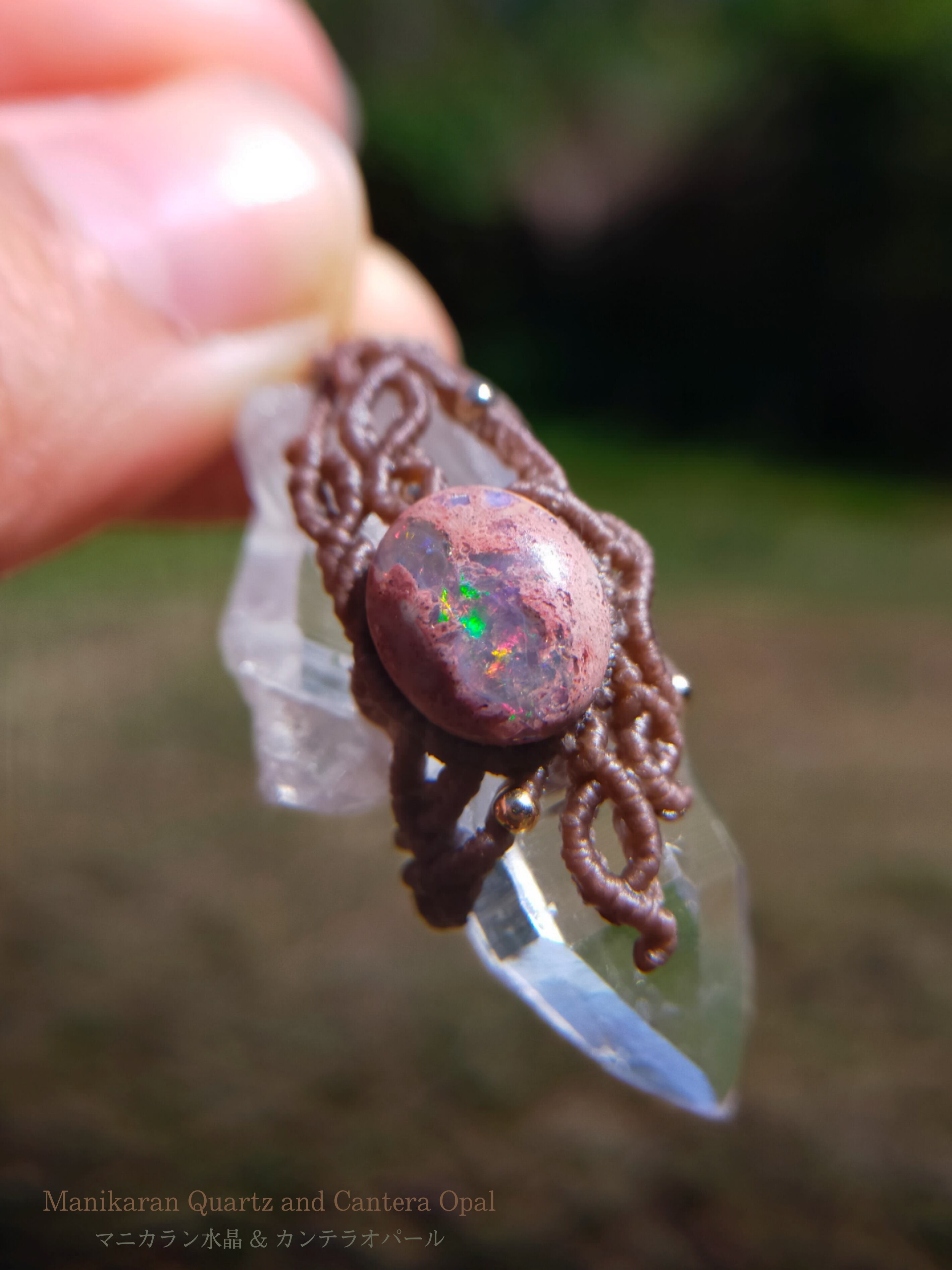 インド、マニカラン産水晶ポイントとメキシコ産カンテラオパールのペンダント。