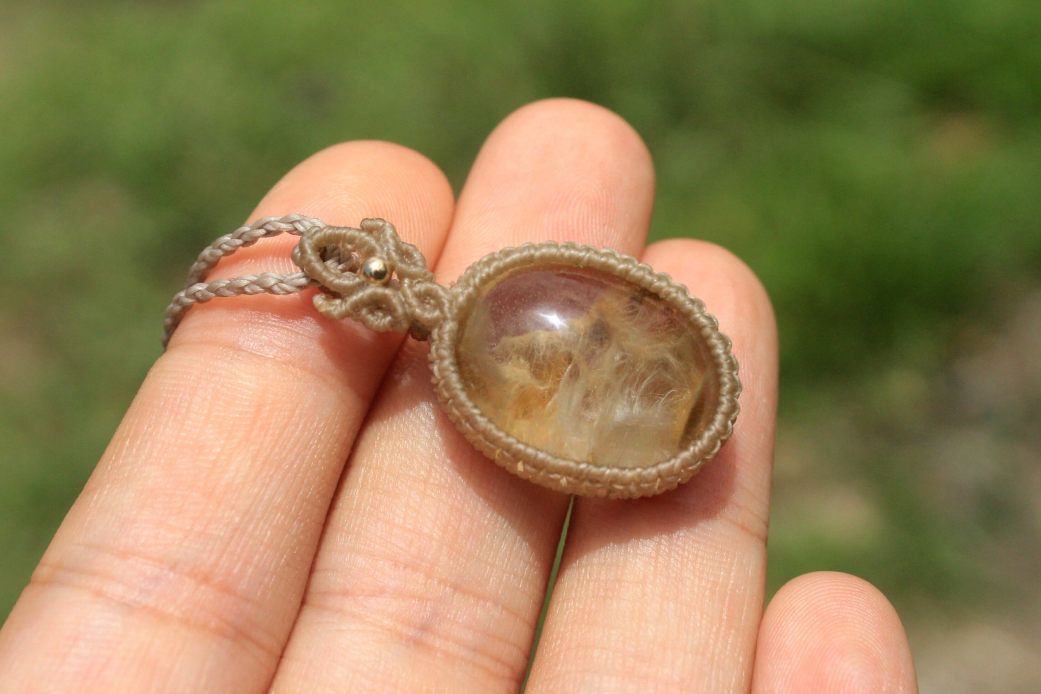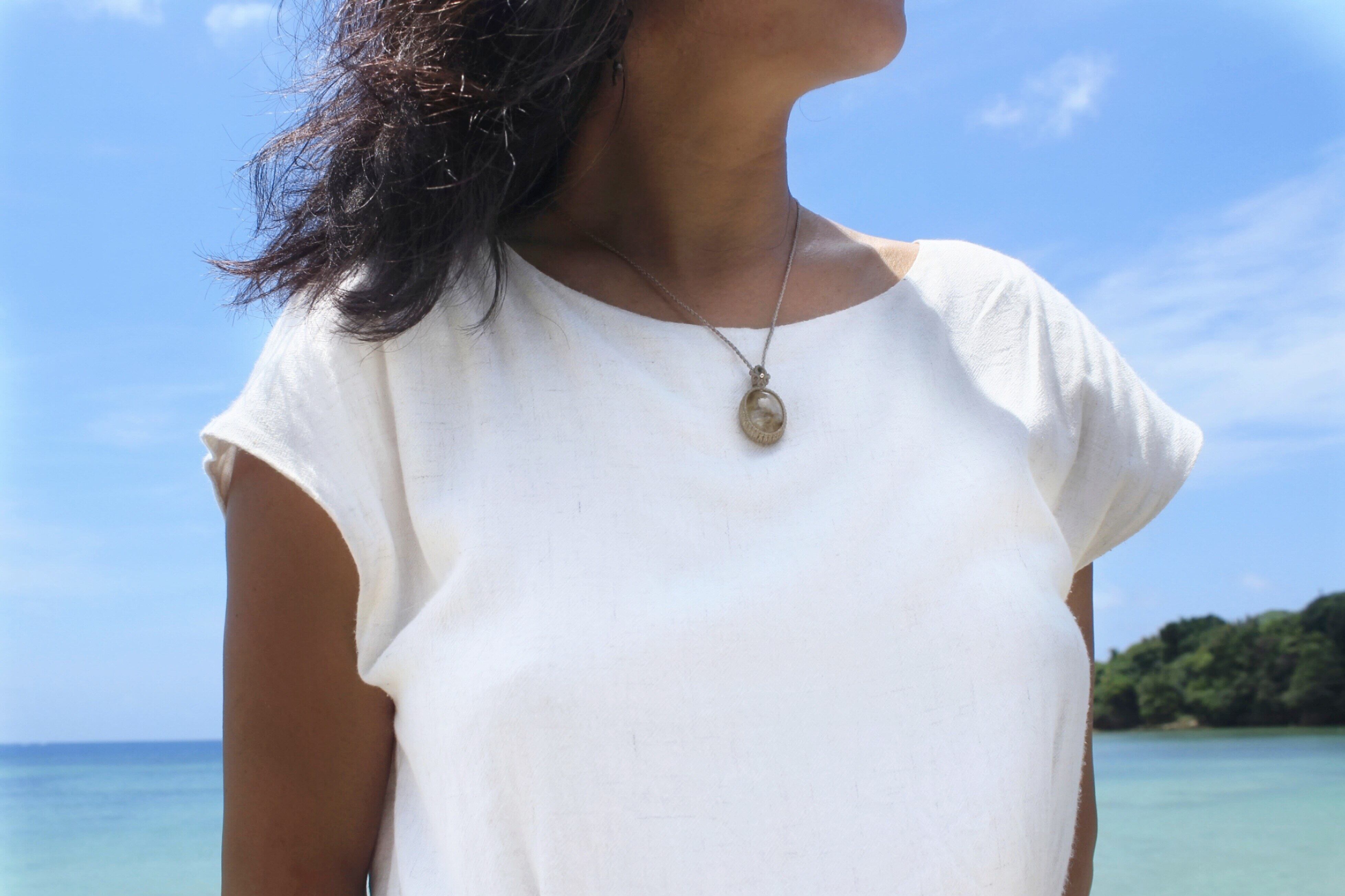 首紐の先端部分には、ルチルクォーツと水晶を使用。大人の女性らしさが後ろ姿からも伝わるかと思います。