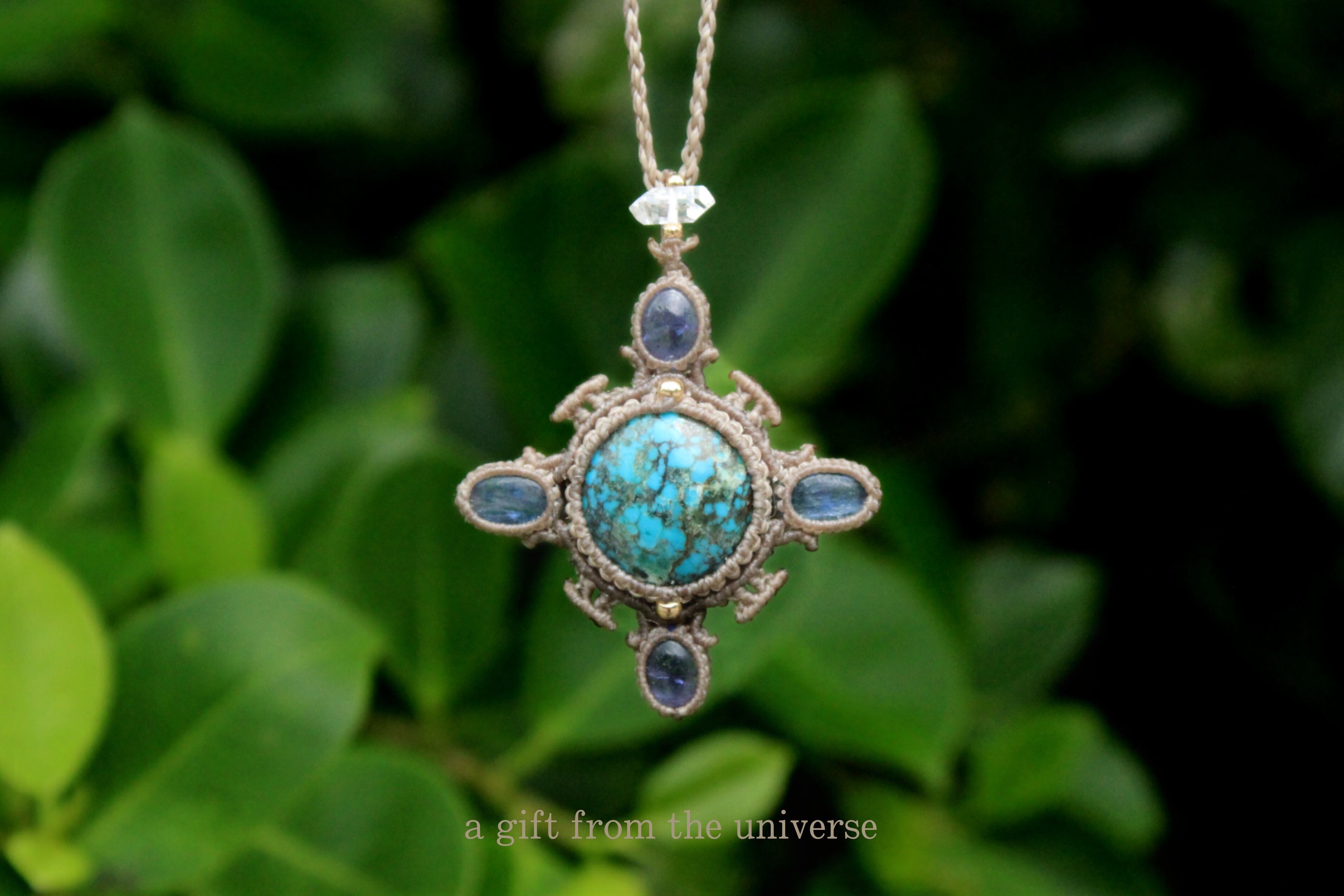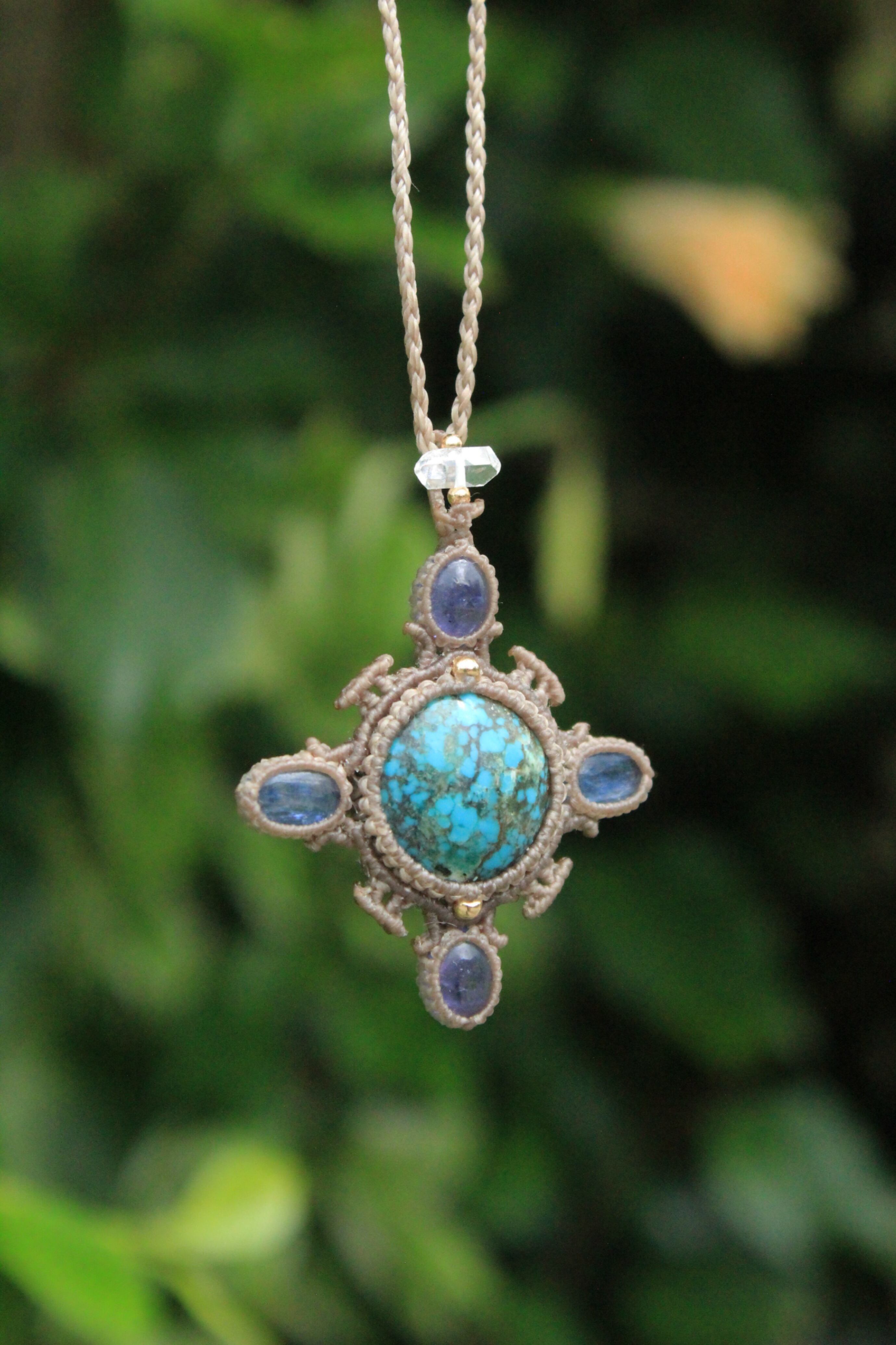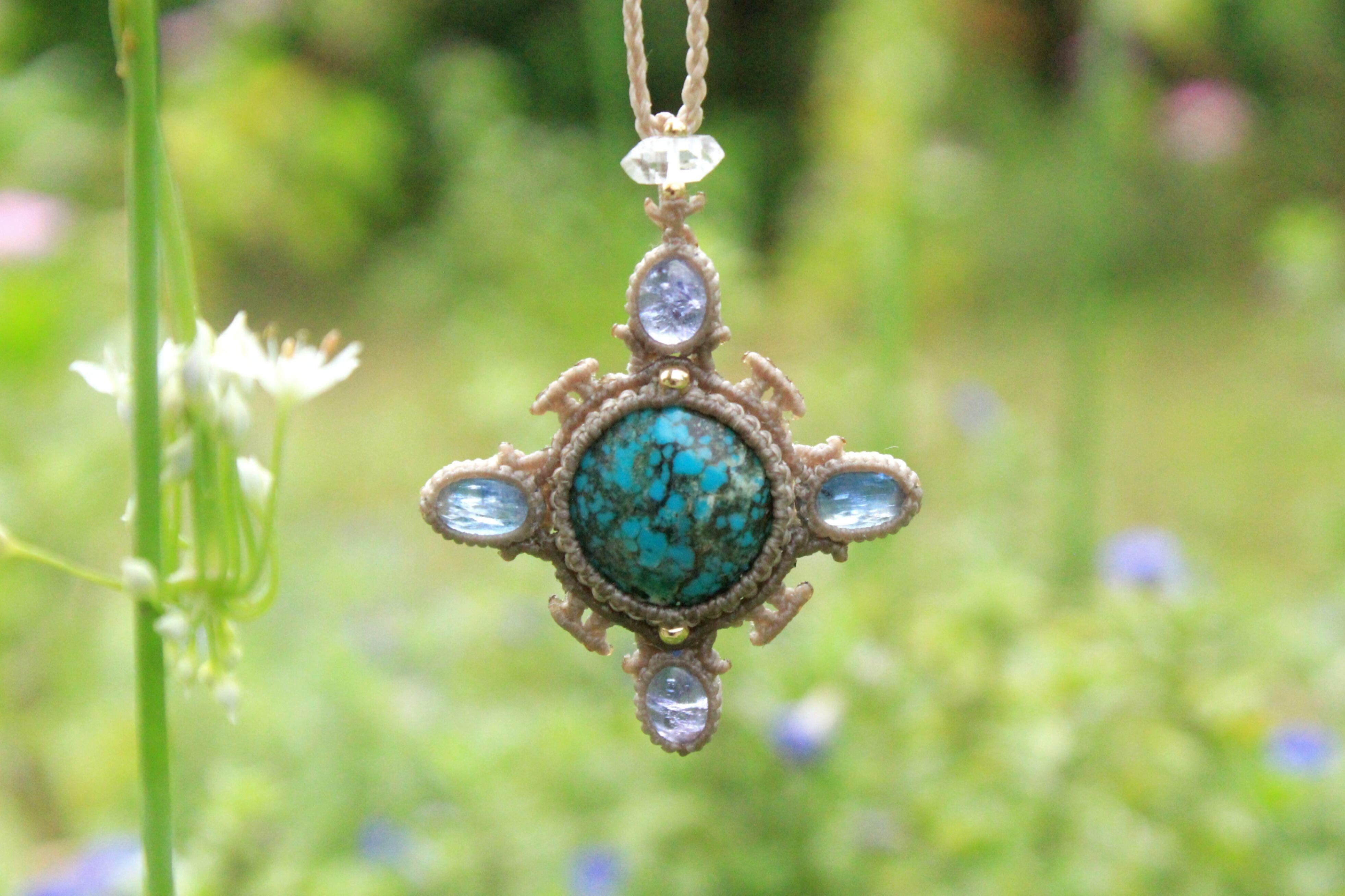 チベットターコイズをメインに、タンザナイトとカイヤナイトをバランス良く散りばめ、ポイントにハーキマーダイヤモンド(水晶)をあしらったオリジナルデザインペンダント。
