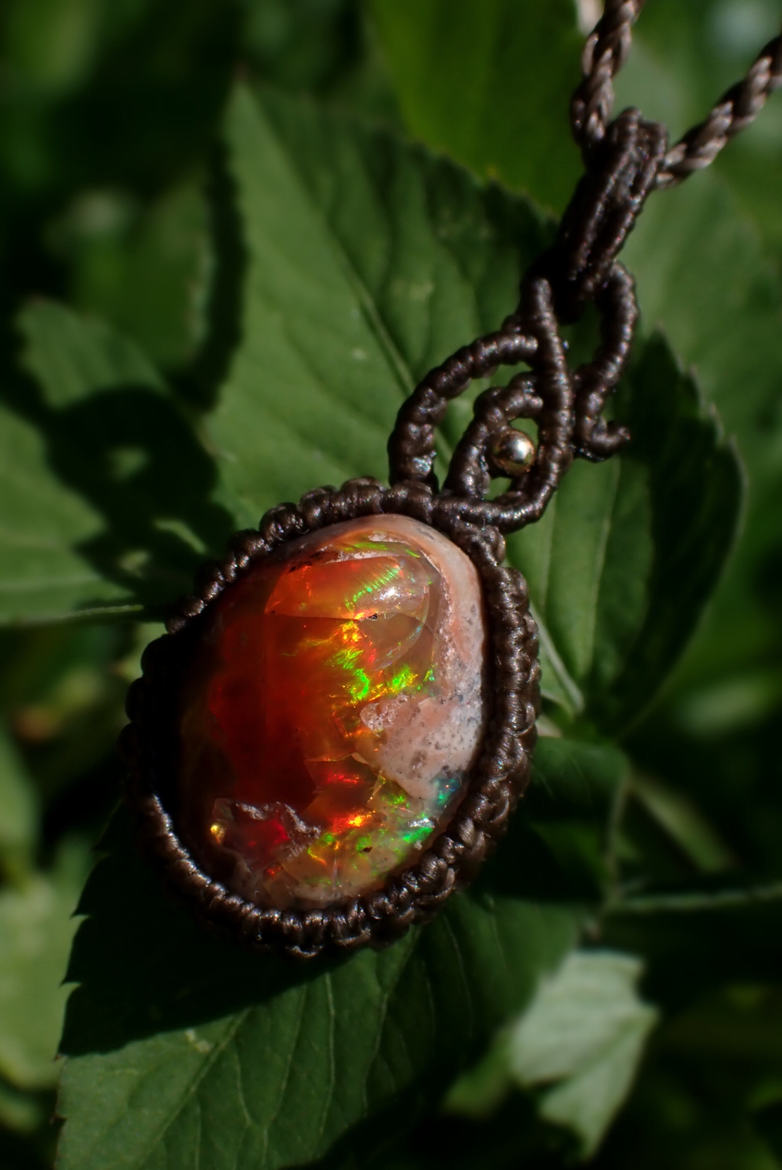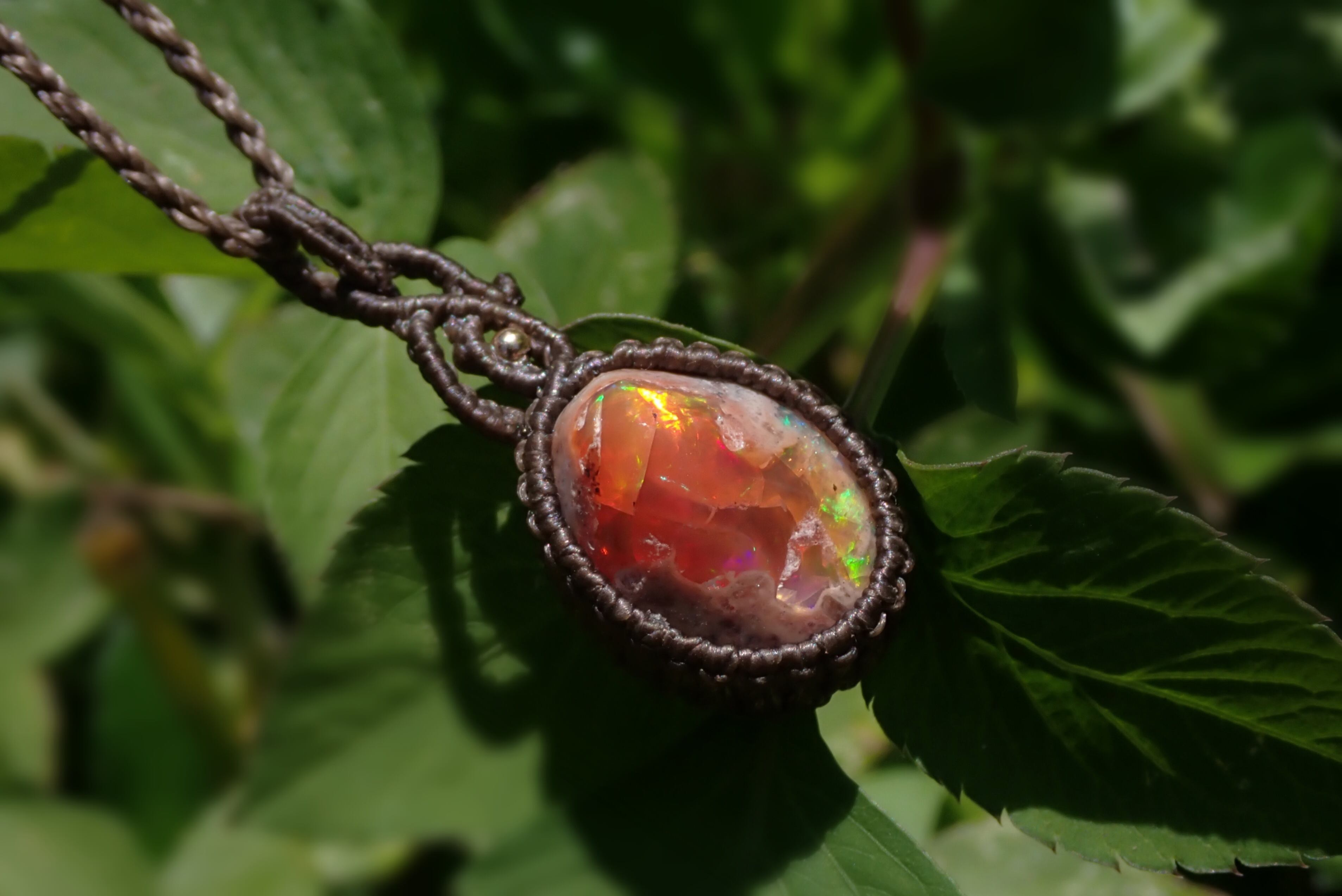 首紐先端には、キラキラのエチオピアンオパールと、こちらも産地にて直接仕入れたメキシコ産アンバー(琥珀)をあしらい、後ろから見ても豪華なペンダントとなっております。