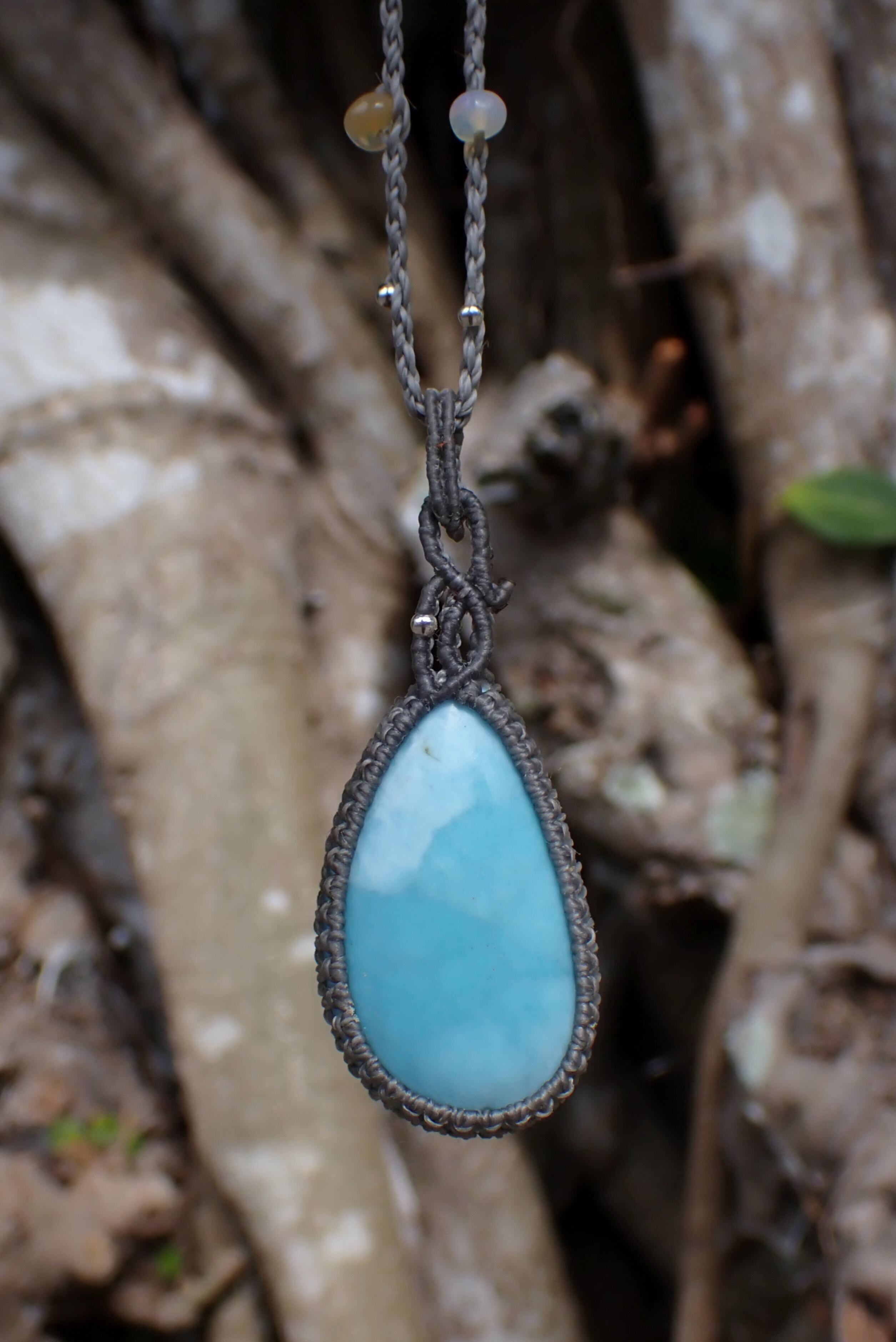 大粒ラリマーのシンプル&ユニークなペンダントトップと、首紐にはエチオピアンオパールとシルバービーズをふんだんにあしらった豪華なペンダント。