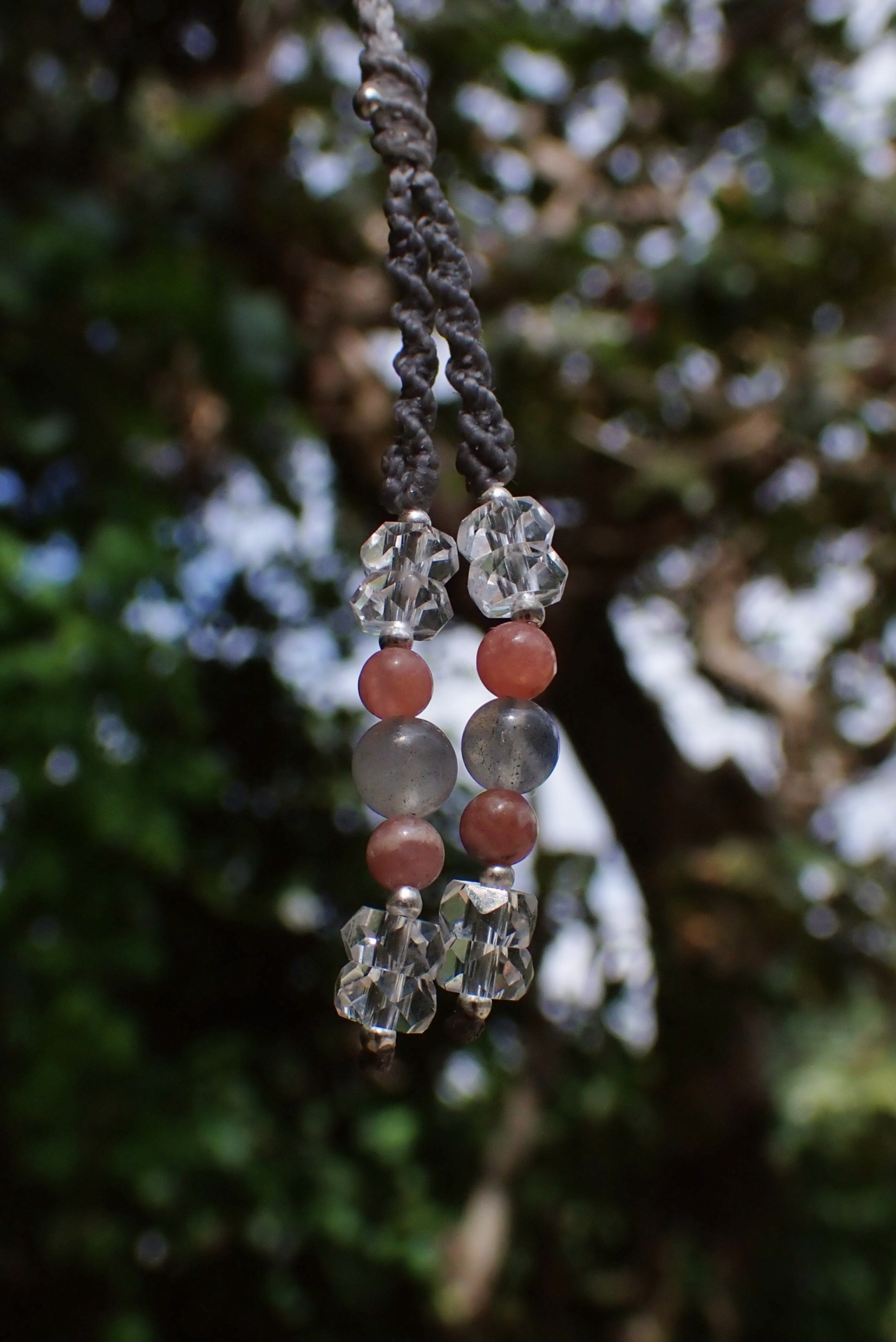 ライトグレーのコードでクールにまとめ、首紐の先端には水晶、インカローズ、ラブラドライトのビーズで、クールさも女性らしさも感じるこだわりの作品となりました。