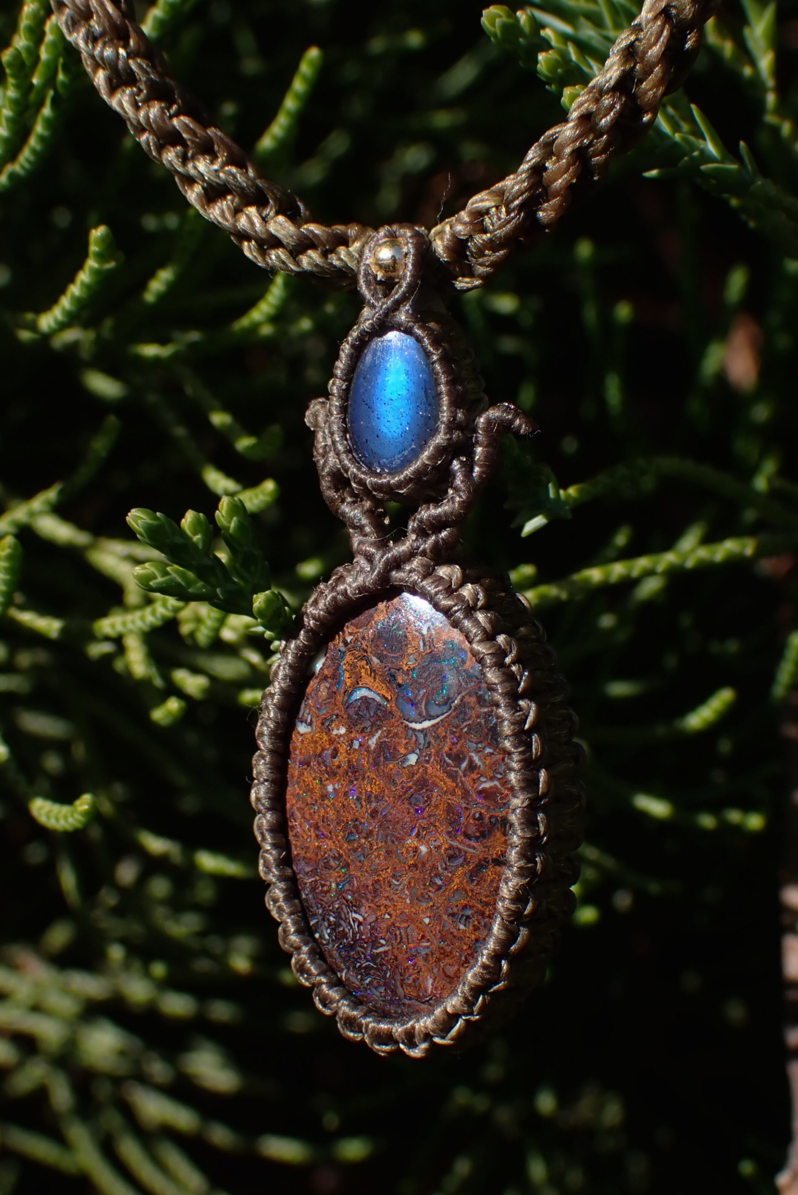 オーストラリア産ボルダーオパールと、ラブラドライトを組み合わせたアースカラーのペンダントです。