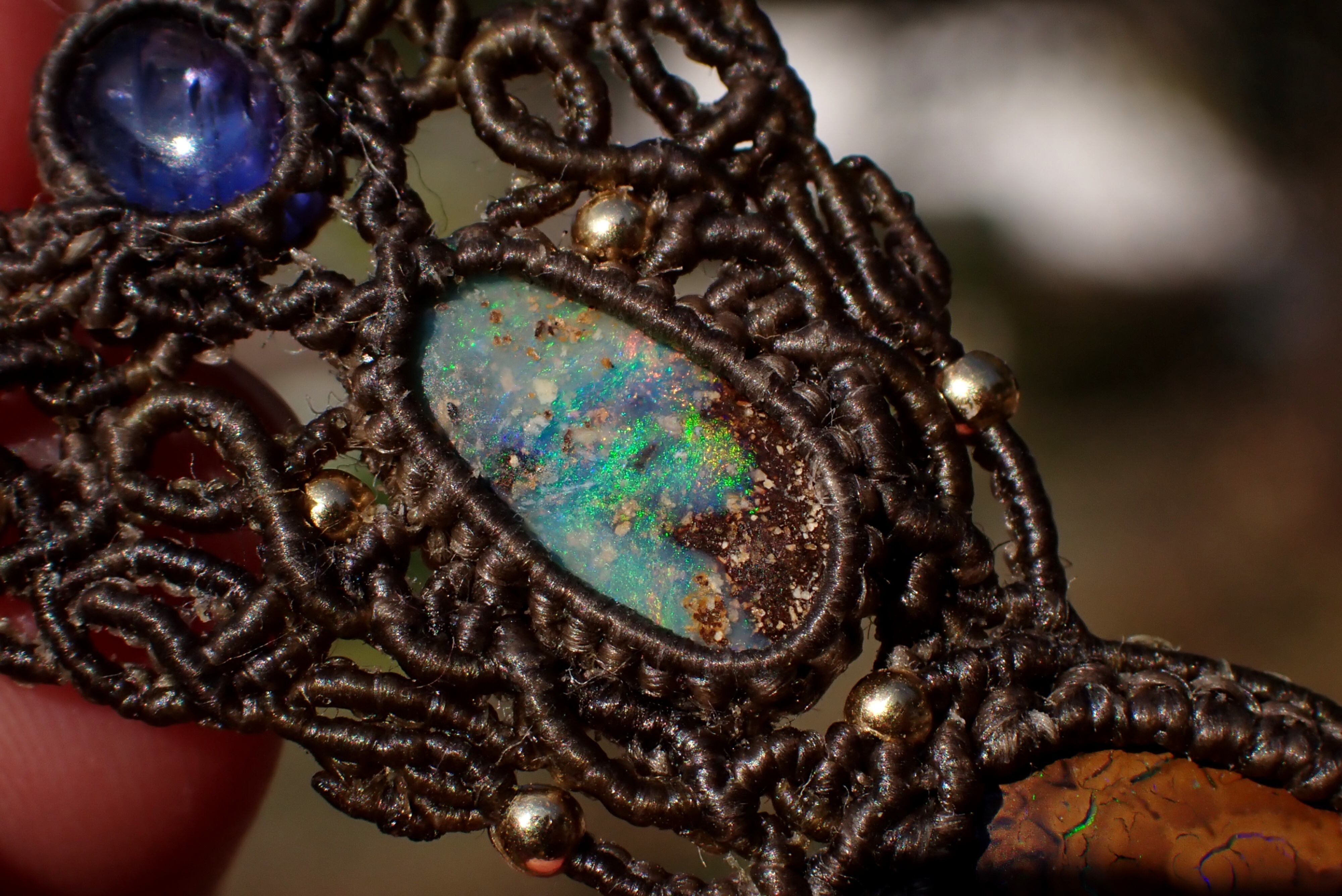 高品質なオーストラリア産ボルダーオパールをふたつ、透明度の高い透き通ったタンザナイトと、その上には宇宙のような神秘的な輝きを持つラブラドライトをふたつ。