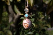 個性的なコロンとかわいらしいカンテラオパールと、虹色の輝きが美しいレインボームーンストーン、発色の良い良質なラリマーを組み合わせたシンプルなデザインペンダント。