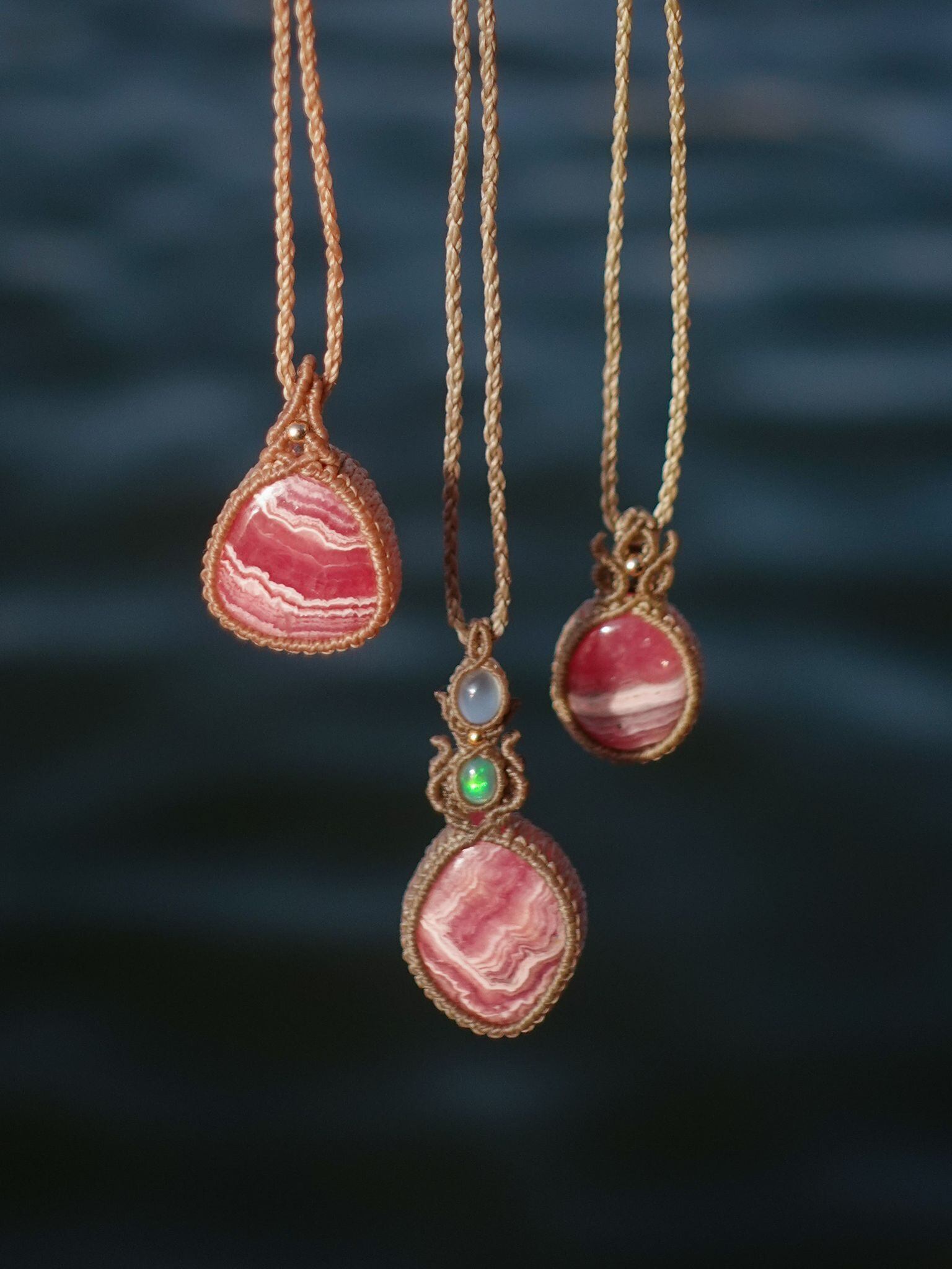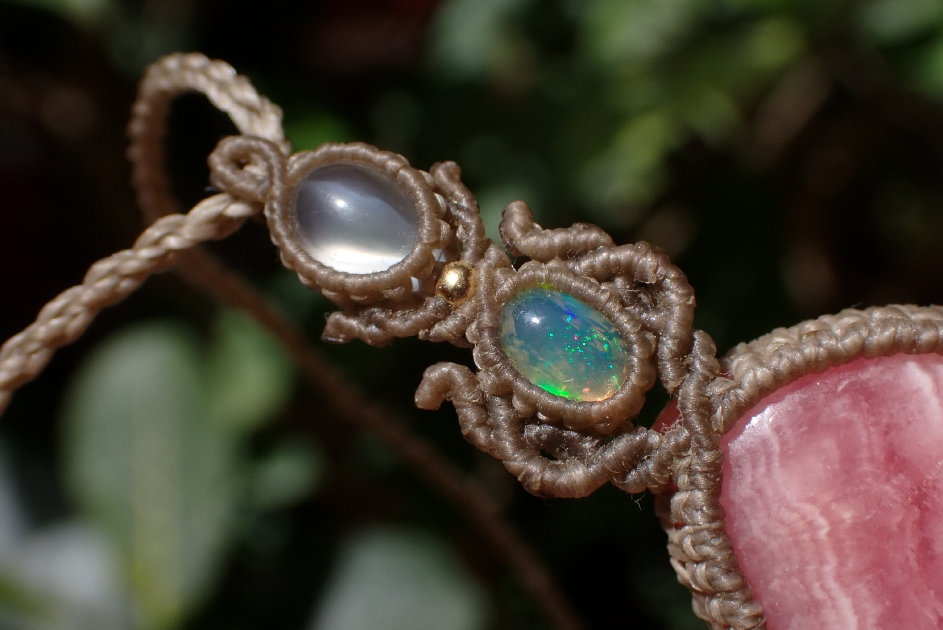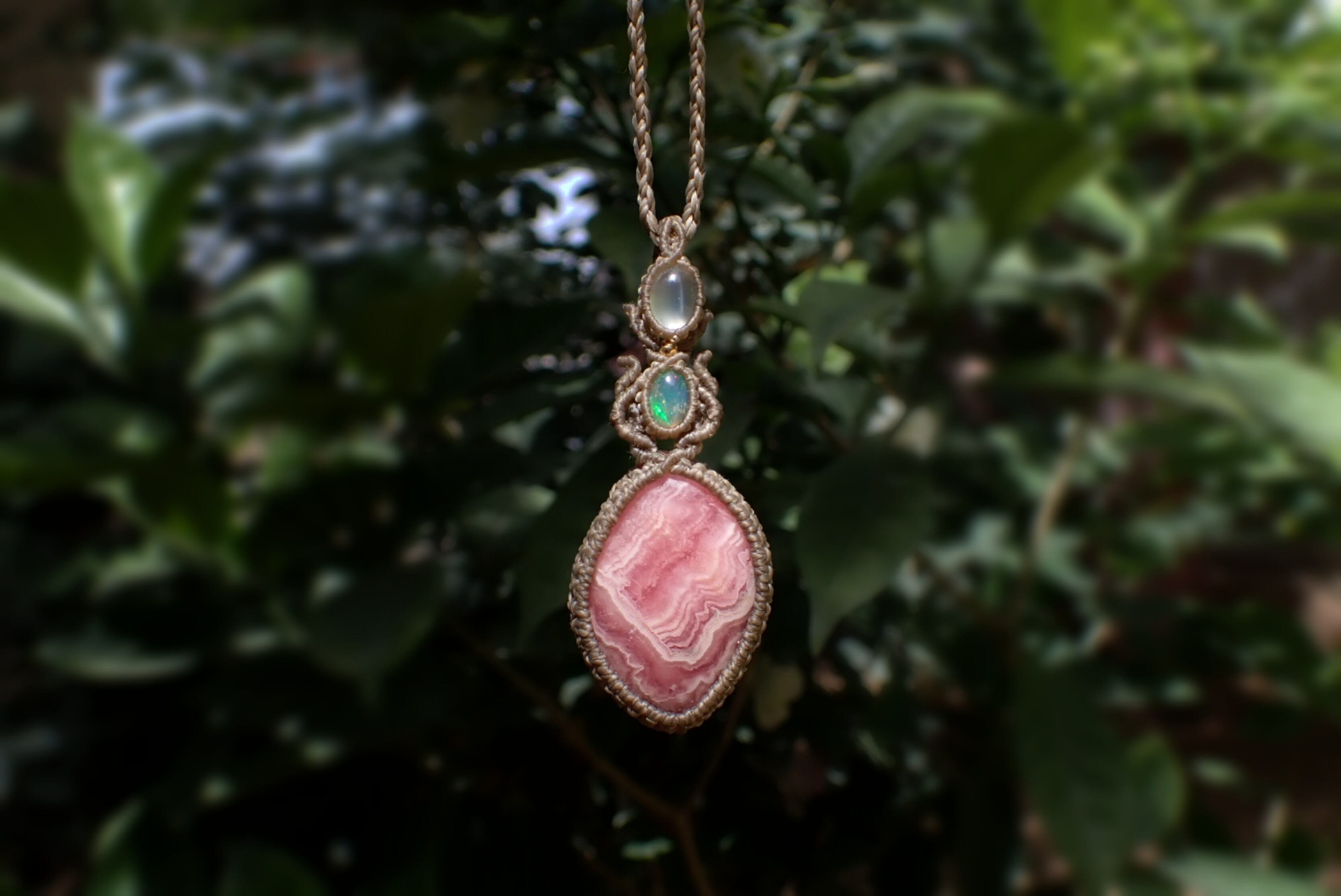 インカローズ、エチオピアンオパール、キャッツアイムーンストーンを組み合わせた女性性の高いペンダント。