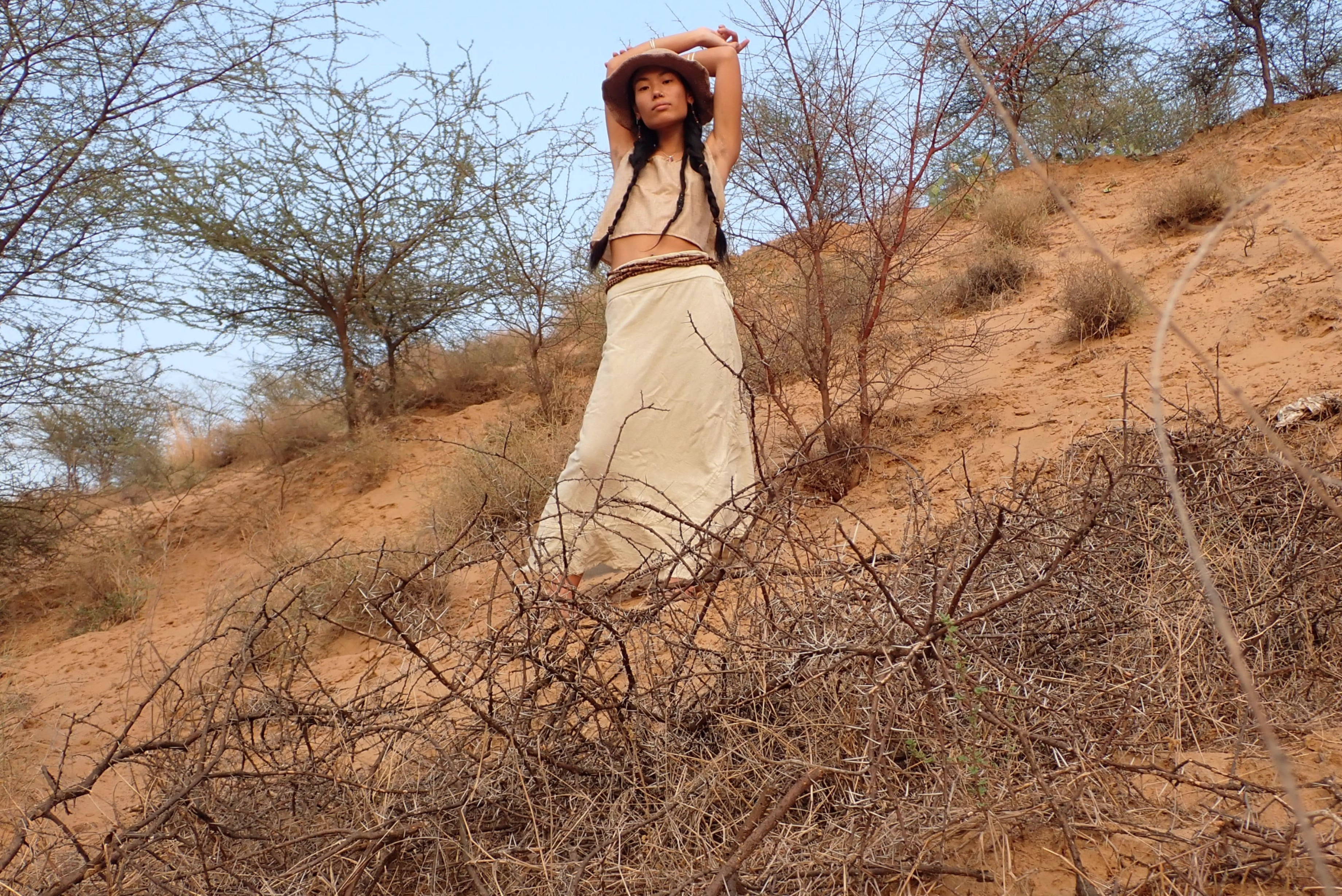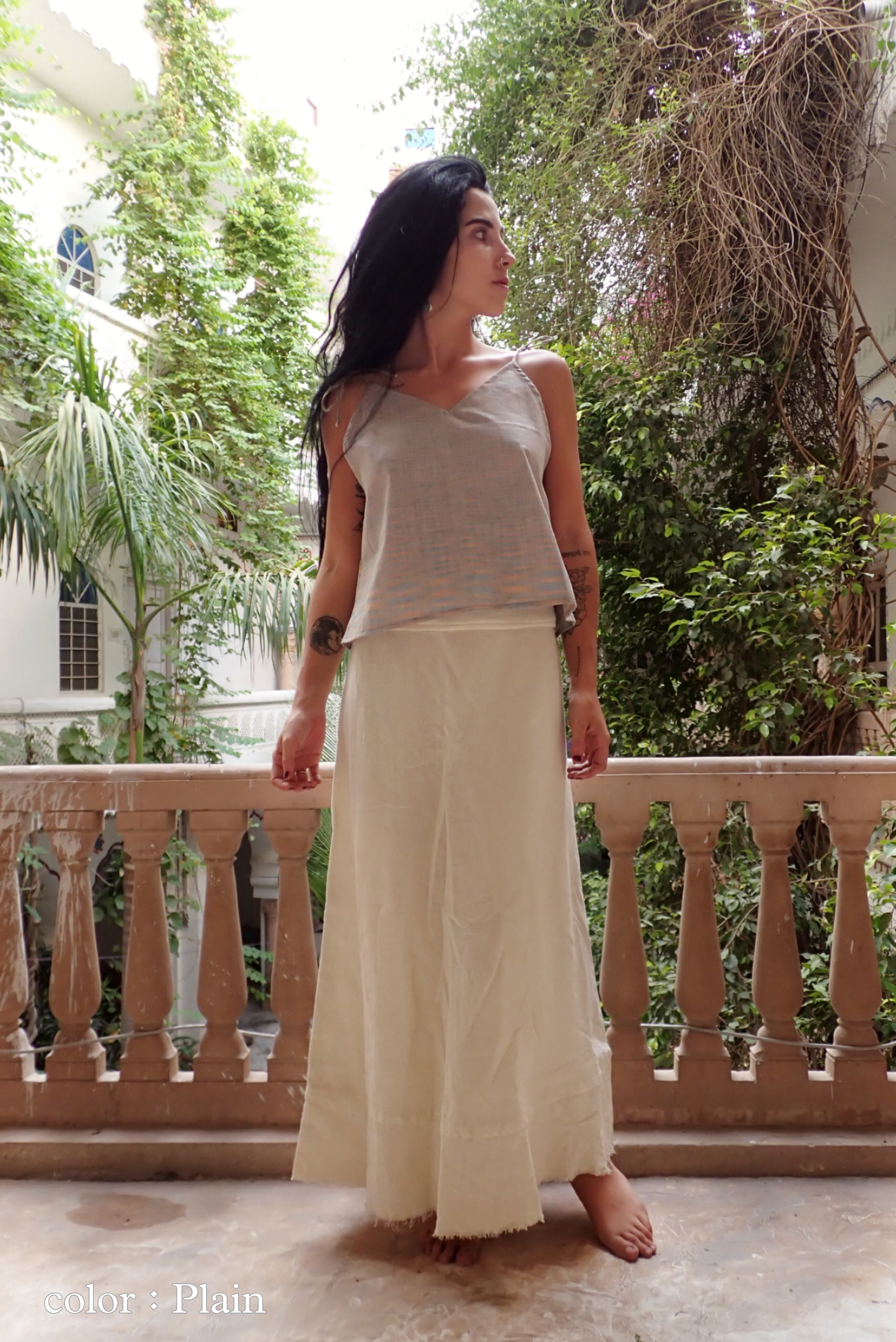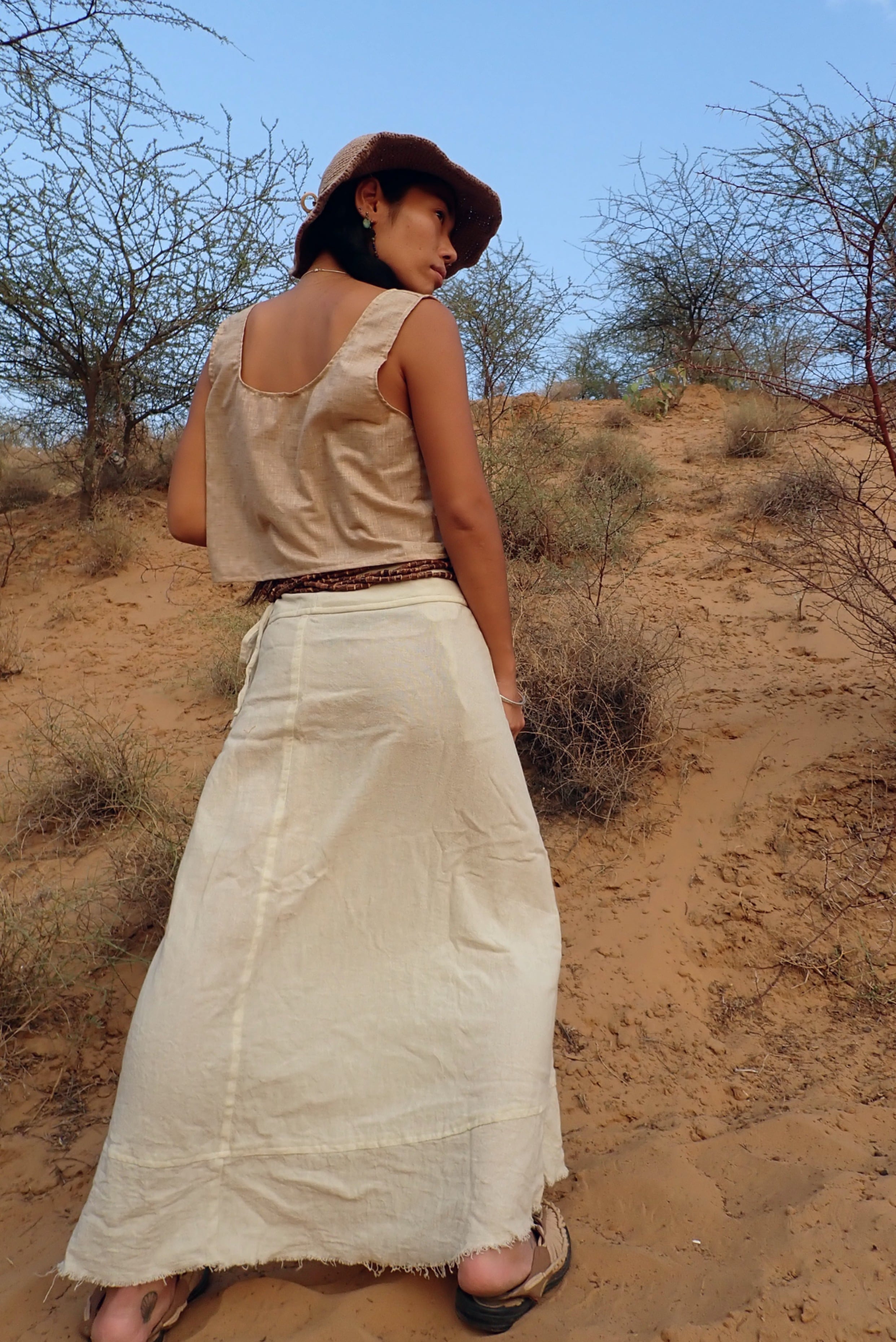 巻きスカートなのでウエストは紐で2カ所くくって調節していただけます。