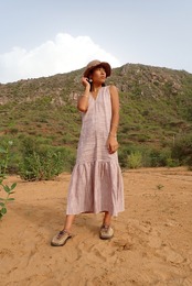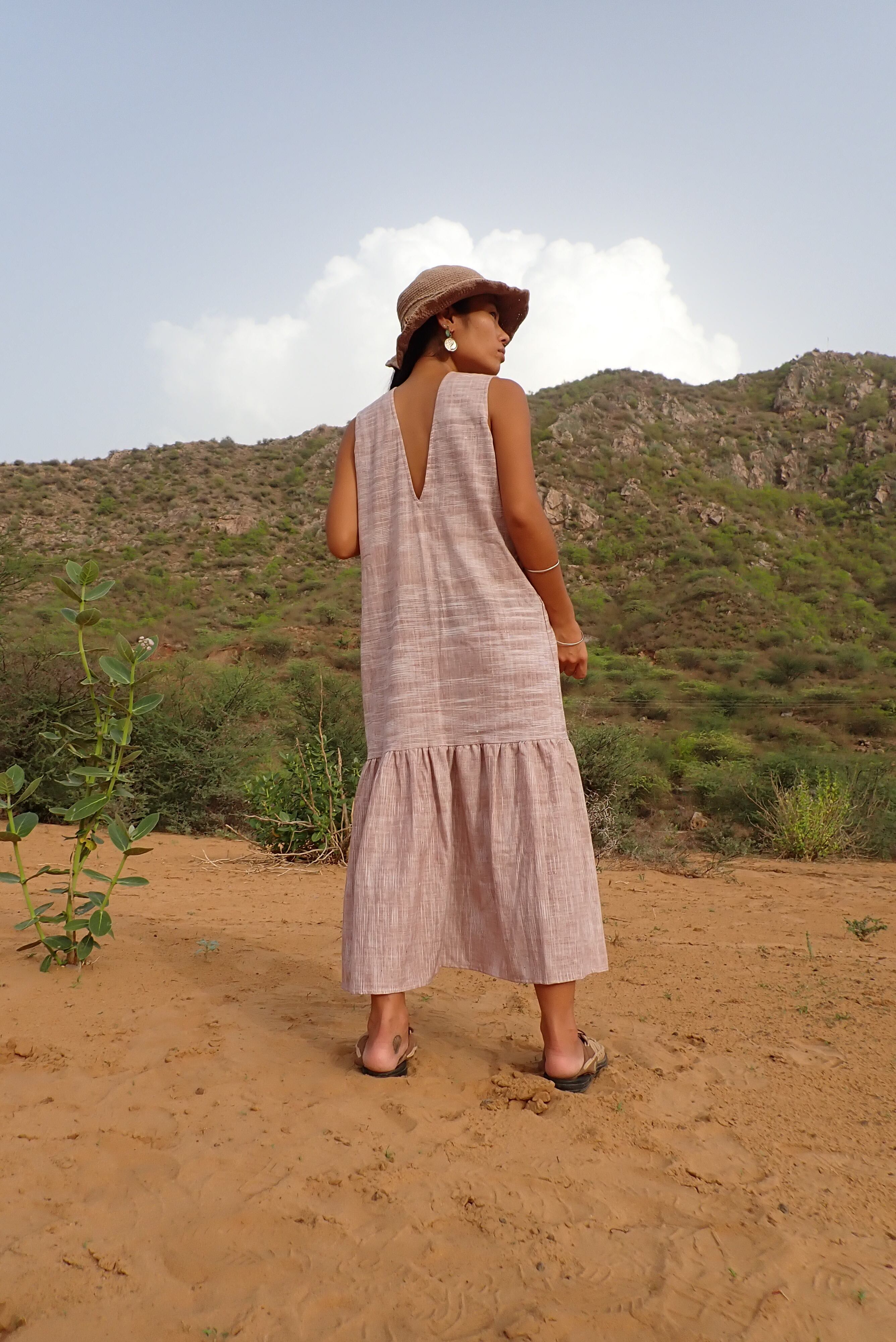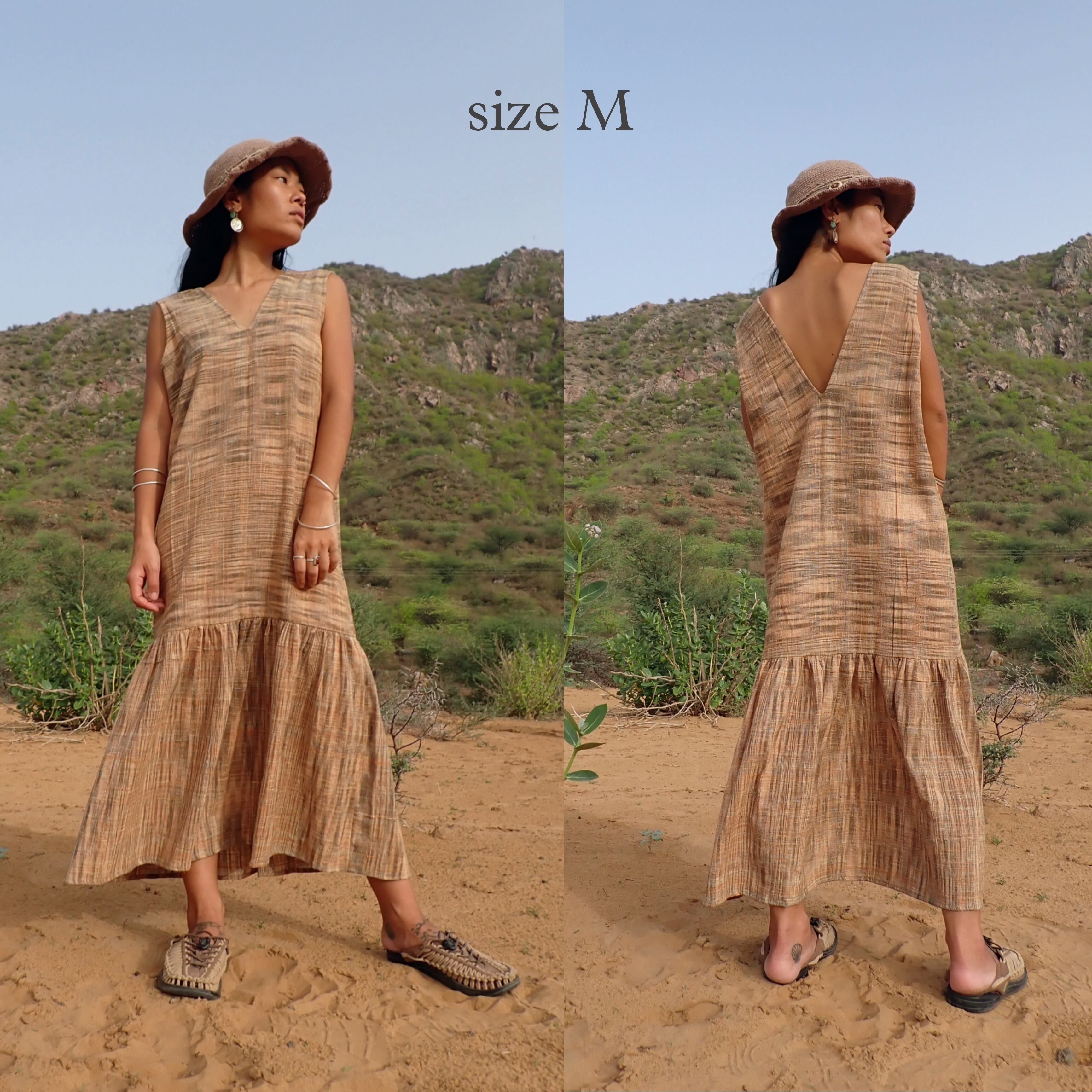 ゆるゆるオーバーサイズながらも、背中が空いていて女性らしさのあるドレスです。
