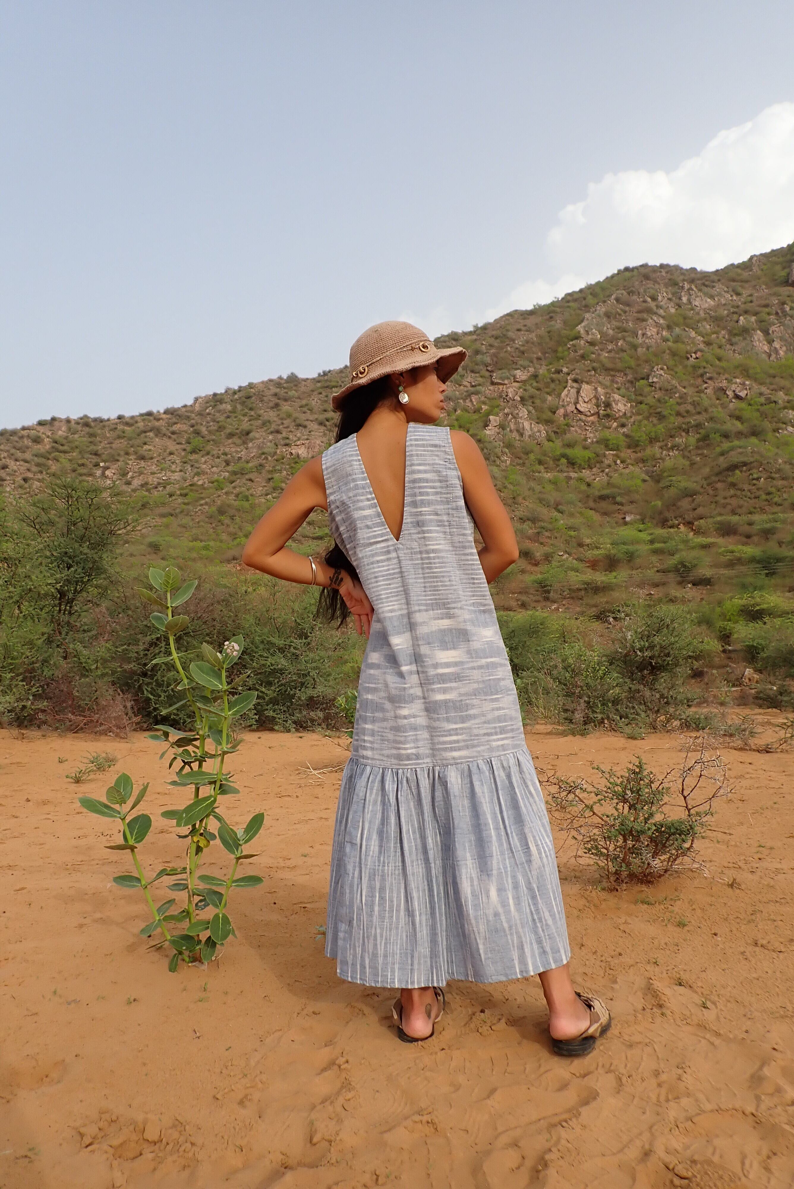 ゆるゆるオーバーサイズながらも、背中が空いていて女性らしさのあるドレスです。