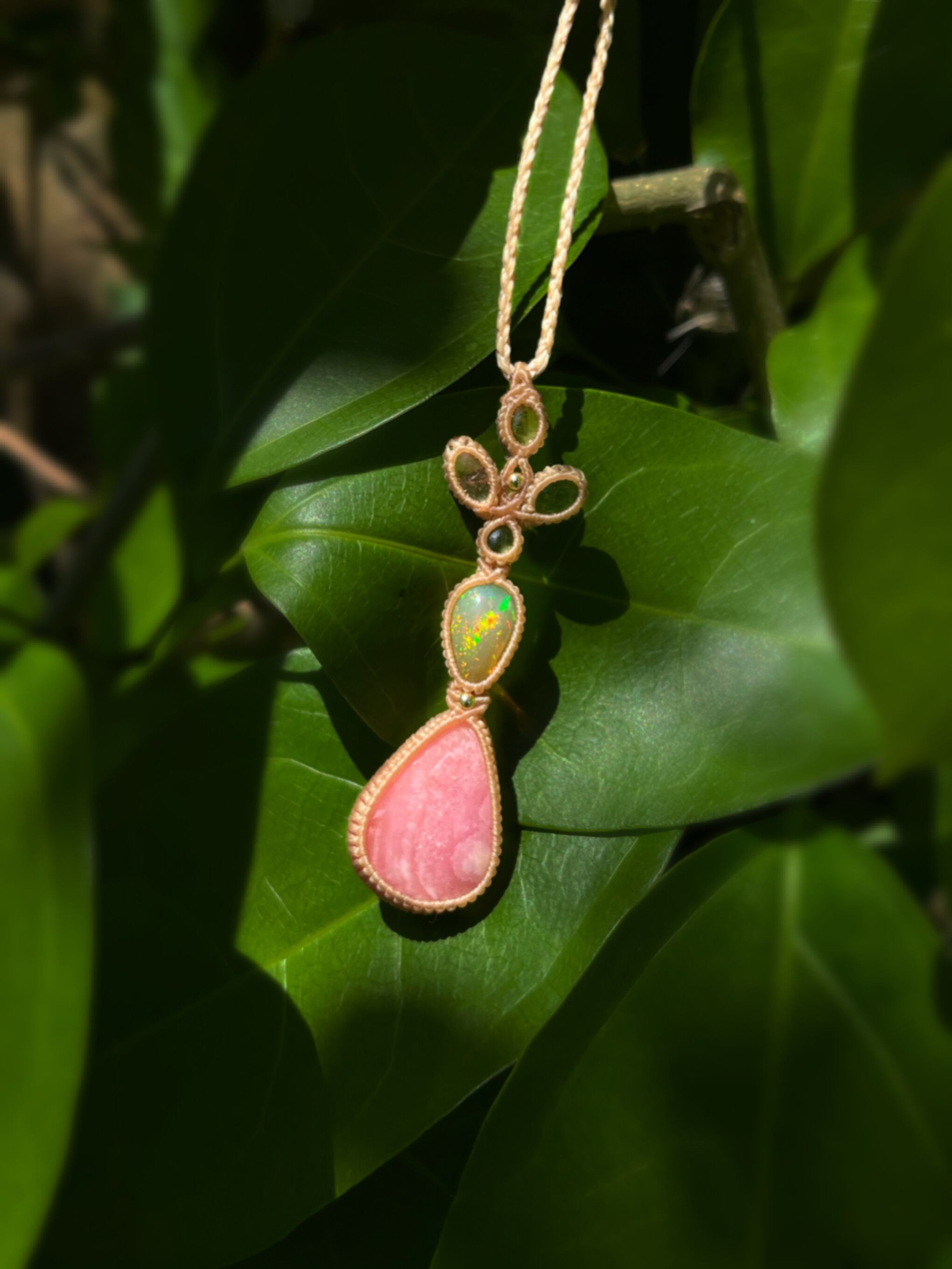 4つのカラフルなトルマリン(イエロー、ピンク、グリーン)と、写真では伝えきれないほど美しいキラキラのオパール、そしてピンク色の可愛らしいインカローズを組み合わせ、女性らしいペンダントに仕上げました。