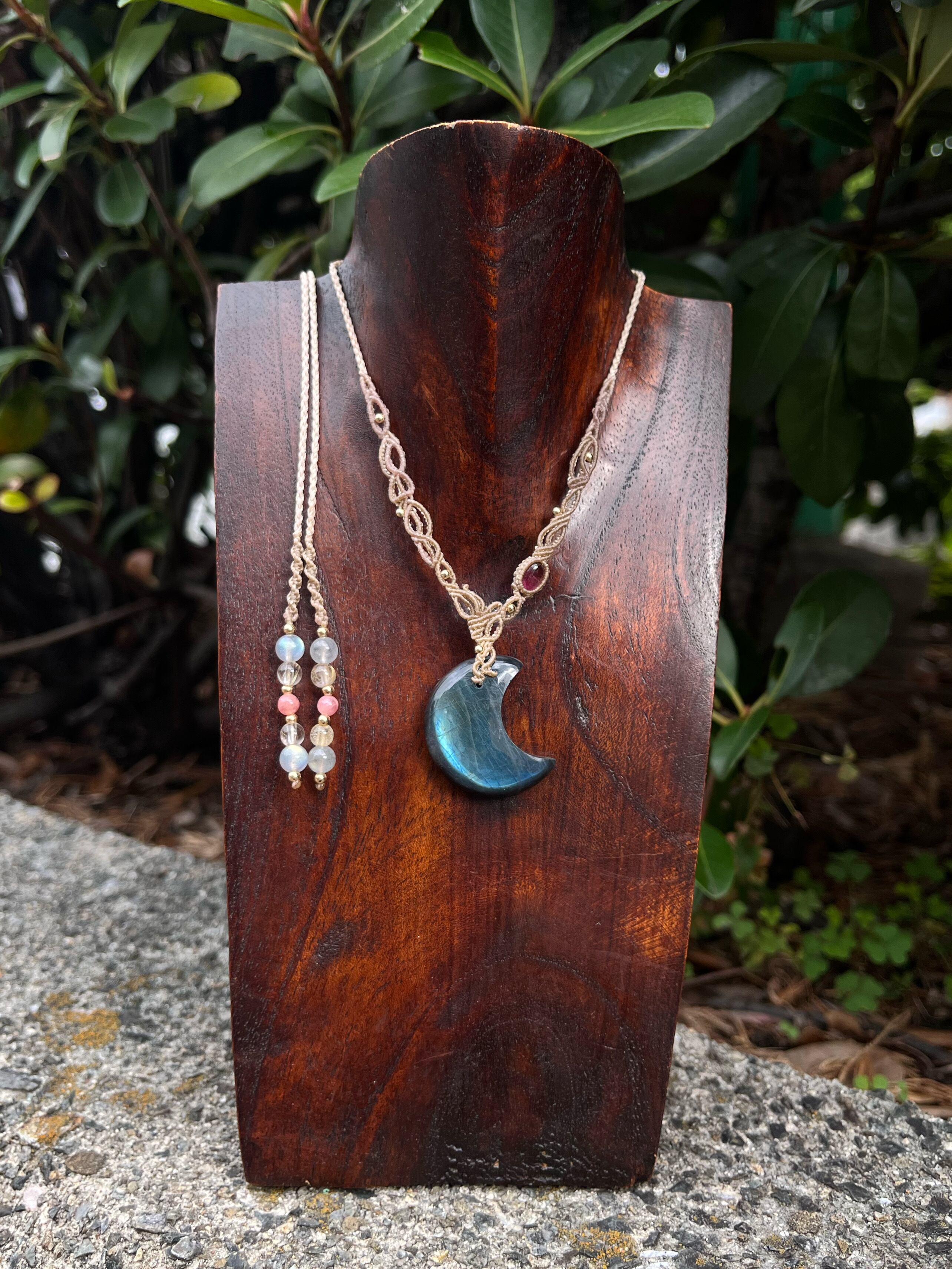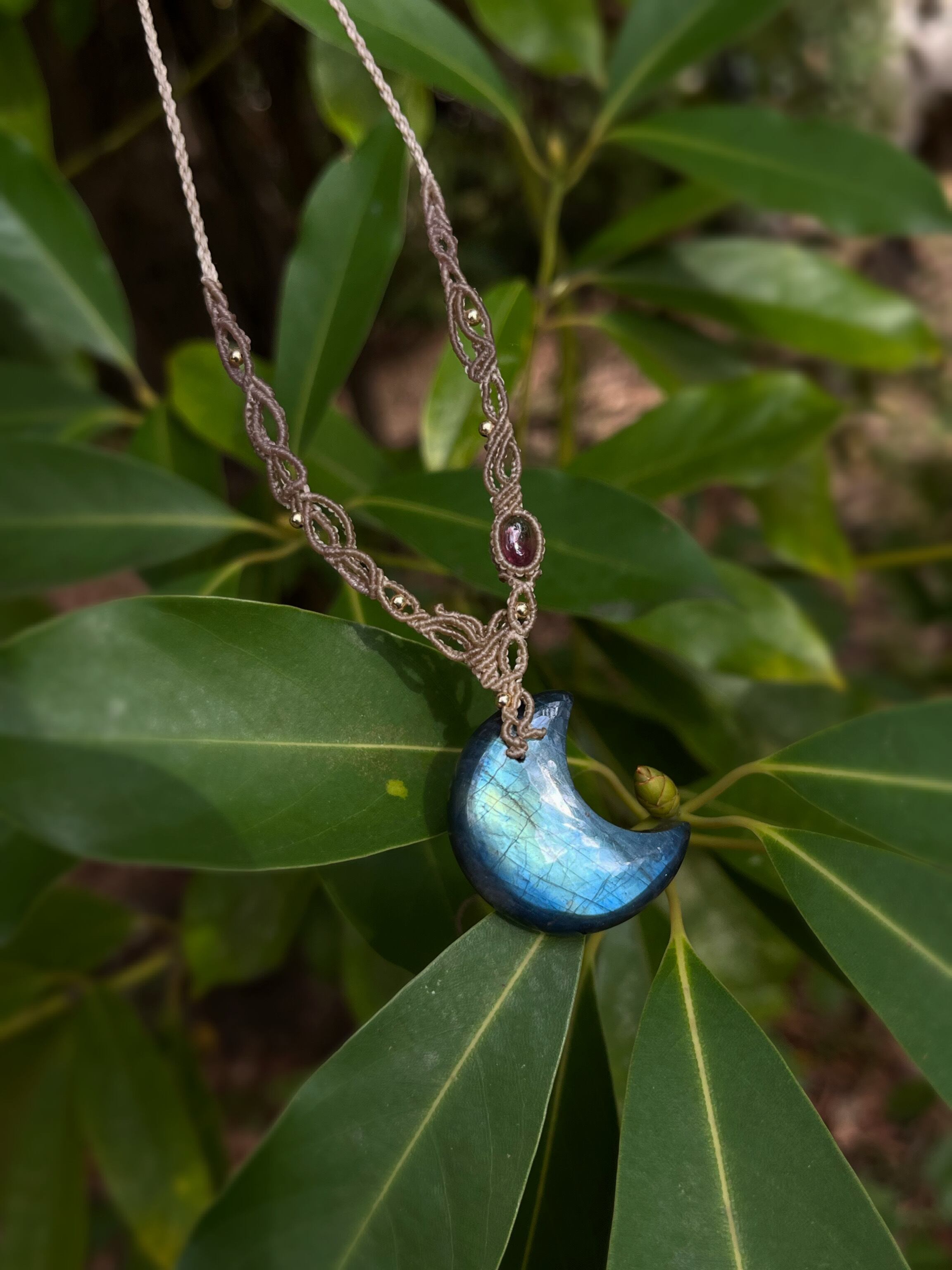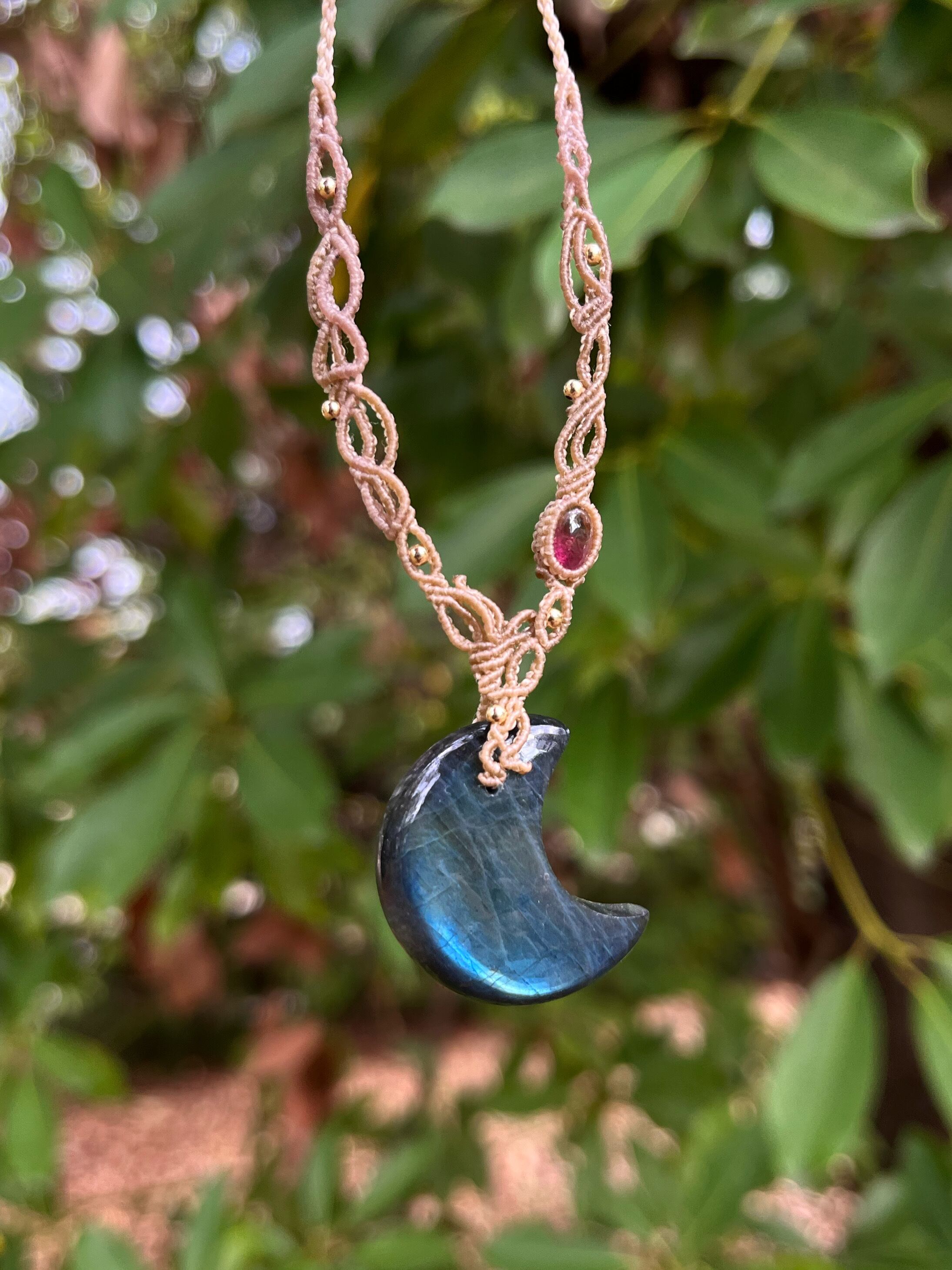 神秘的な優しいシラーのラブラドライトに、ピンクトルマリンを組み合わせ、女性性を感じる繊細なデザインを編みました。