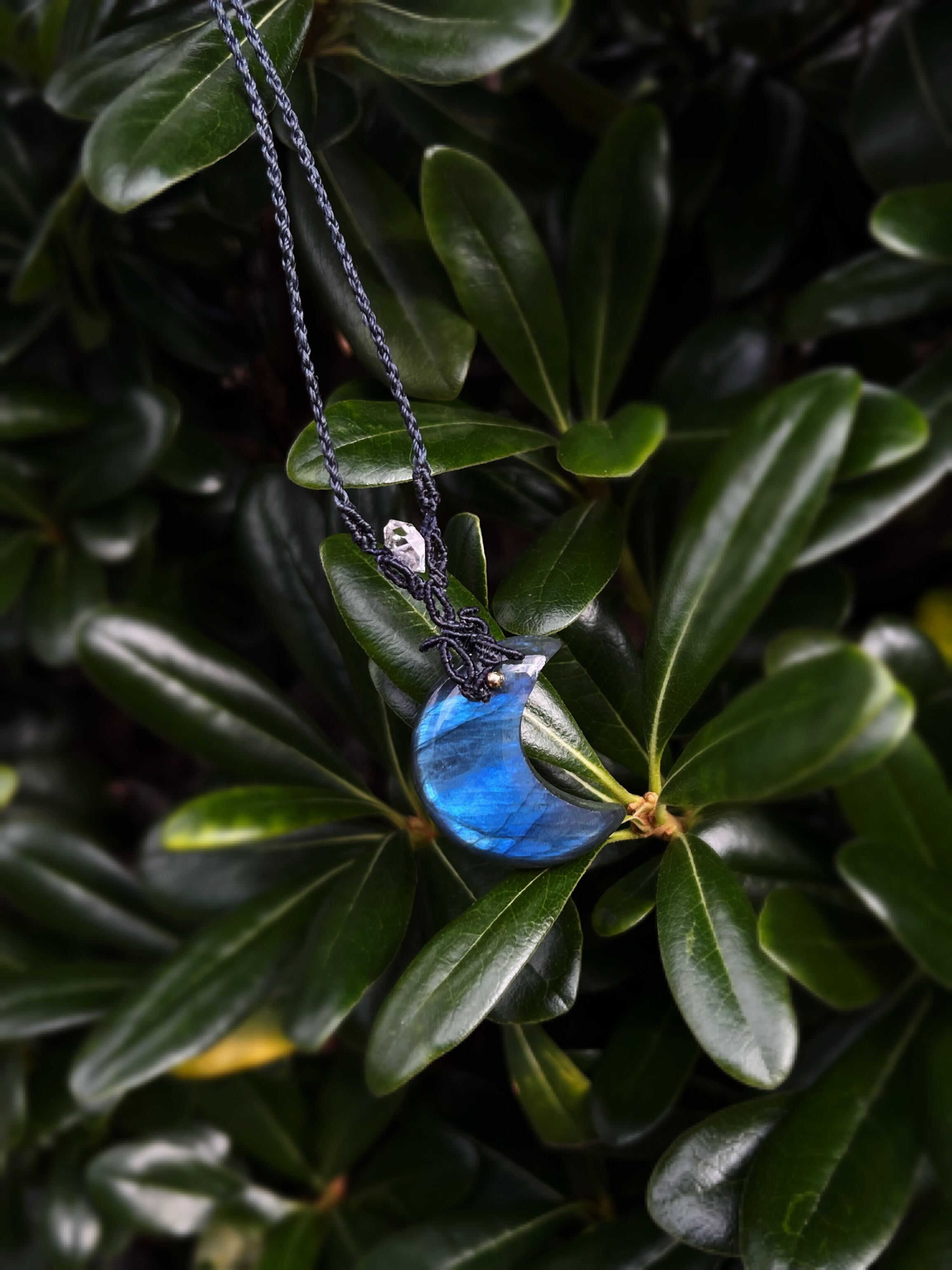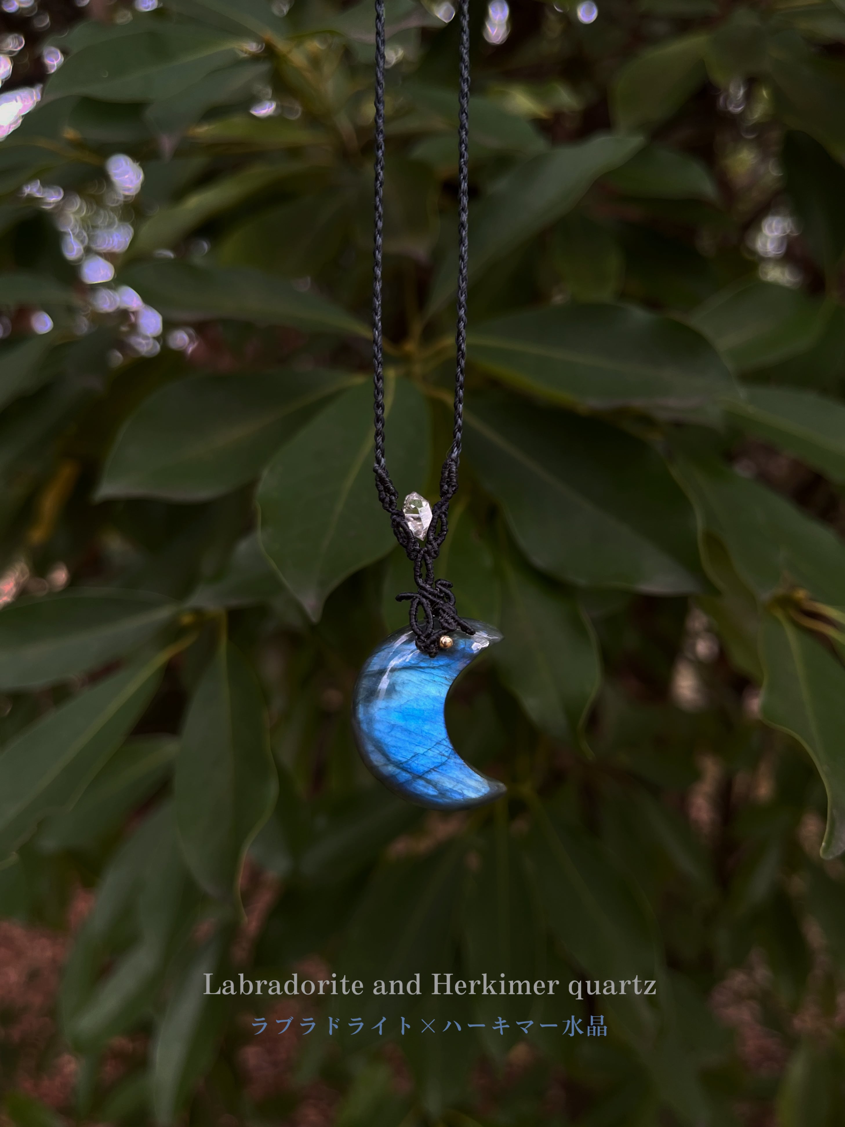 神秘的な輝きを持つお月さま形のラブラドライトと、ハーキマー水晶を組み合わせたペンダント。