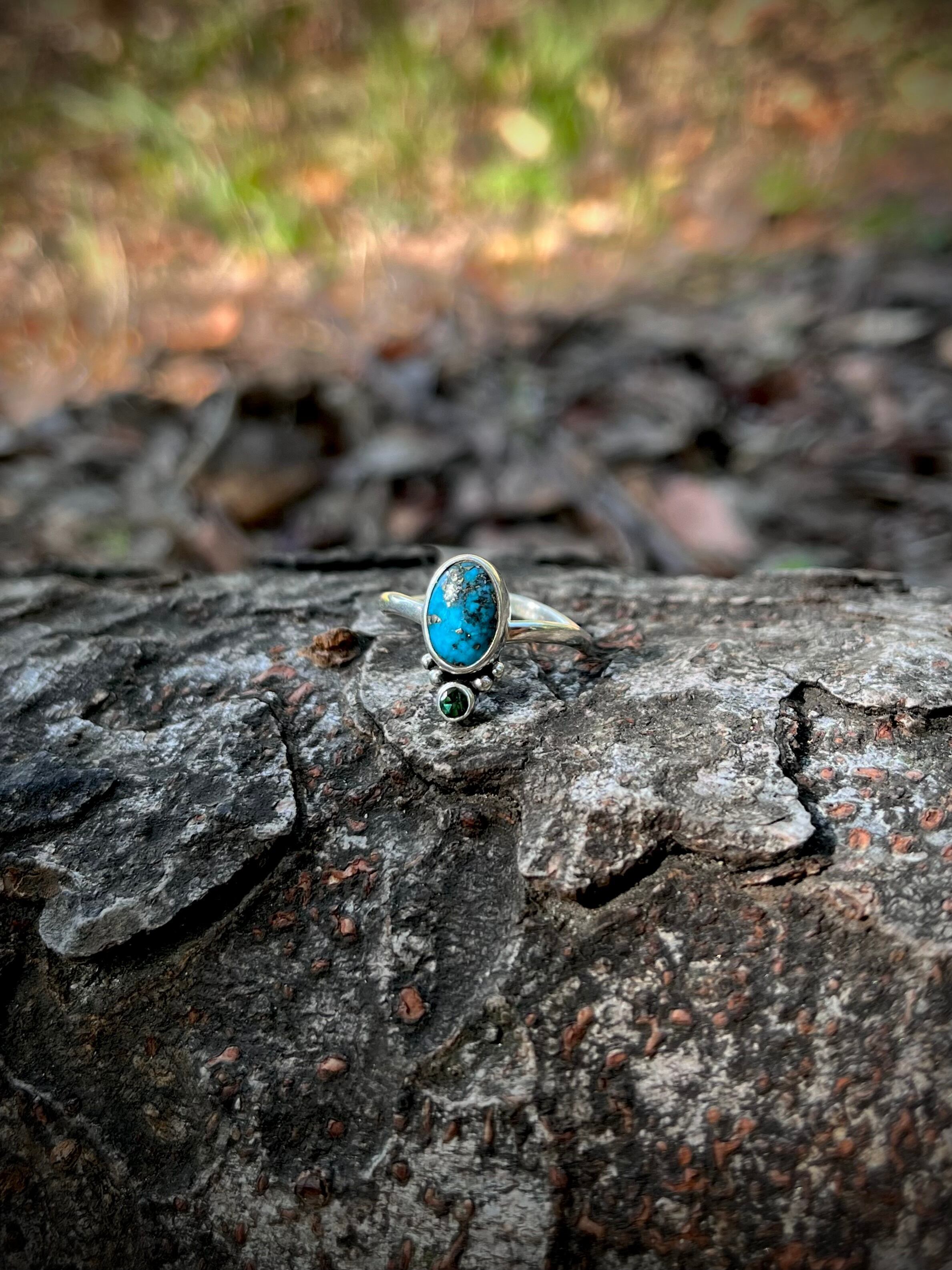 ペルシャンターコイズと、ファセットカットのグリーントルマリンを組み合わせた、カジュアル×ゴージャスなシルバーリング。