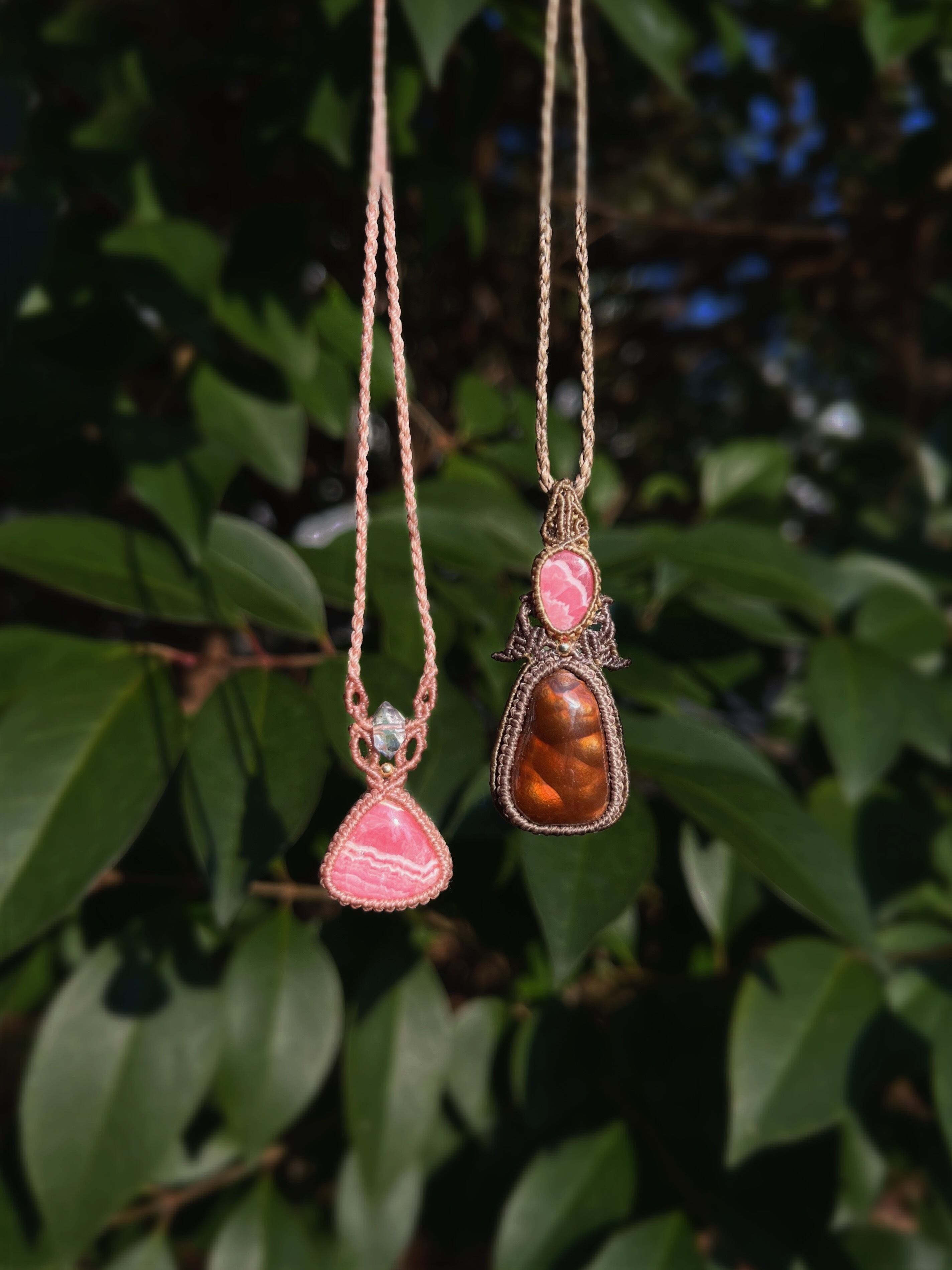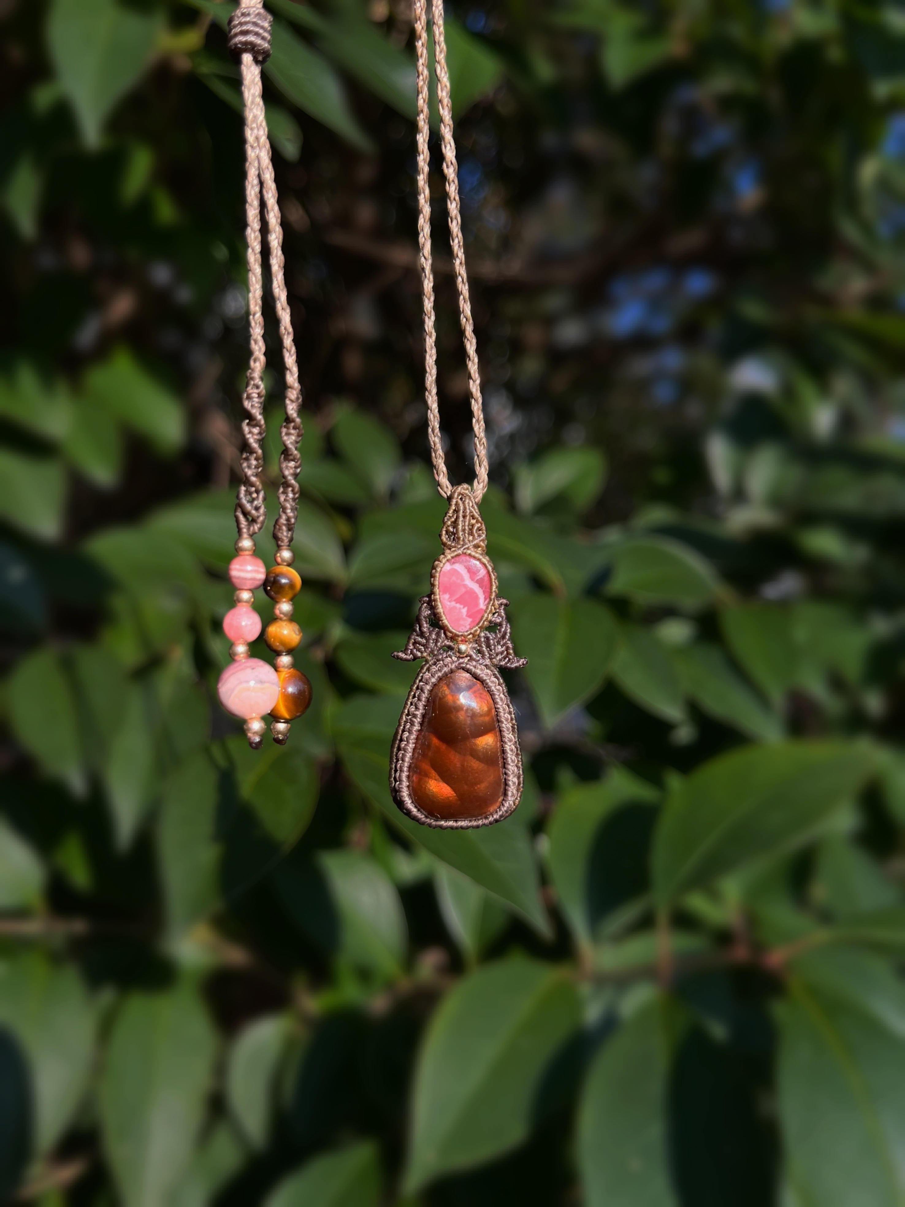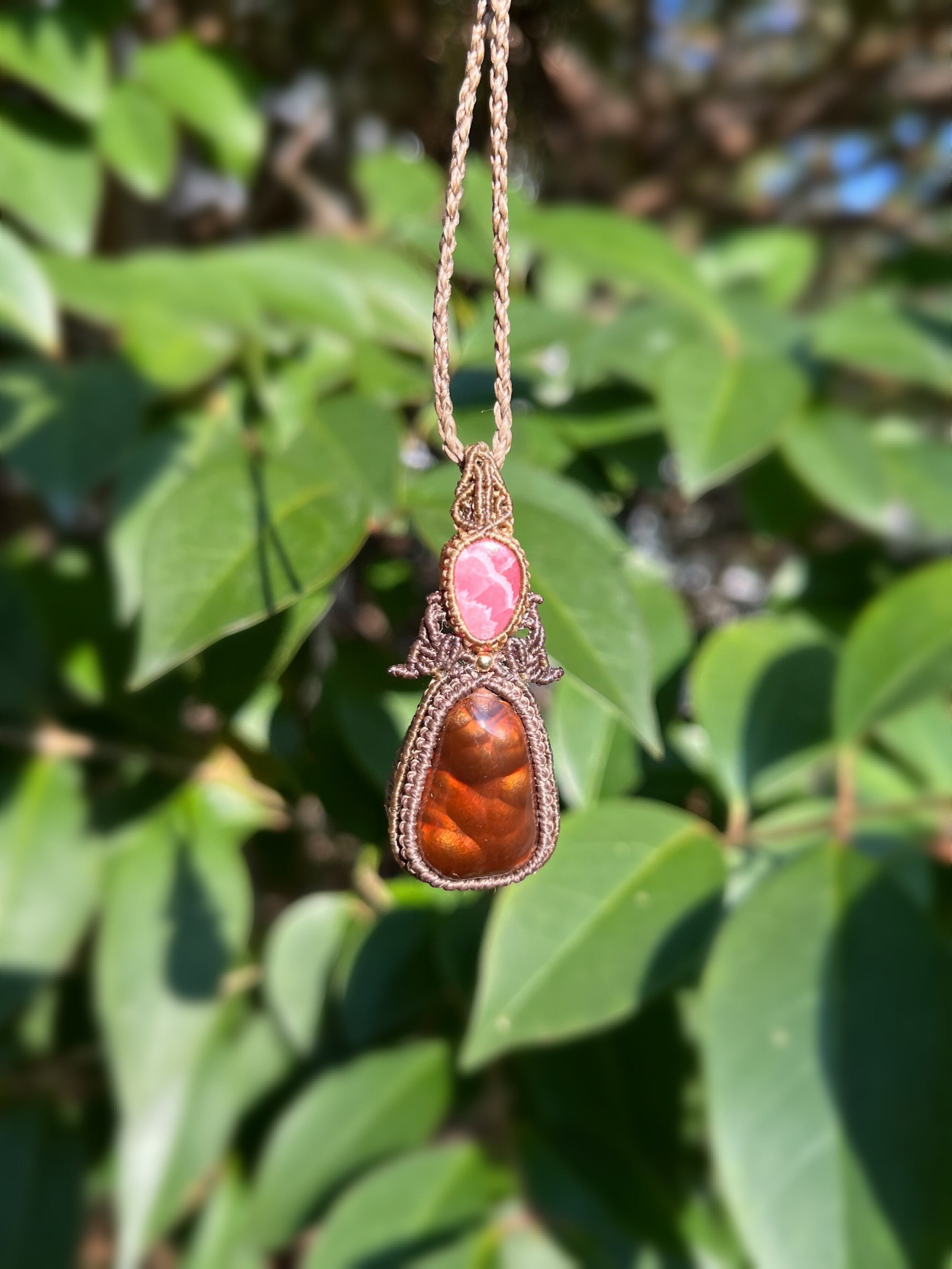 ファイヤーアゲートとインカローズのマクラメデザインペンダント。