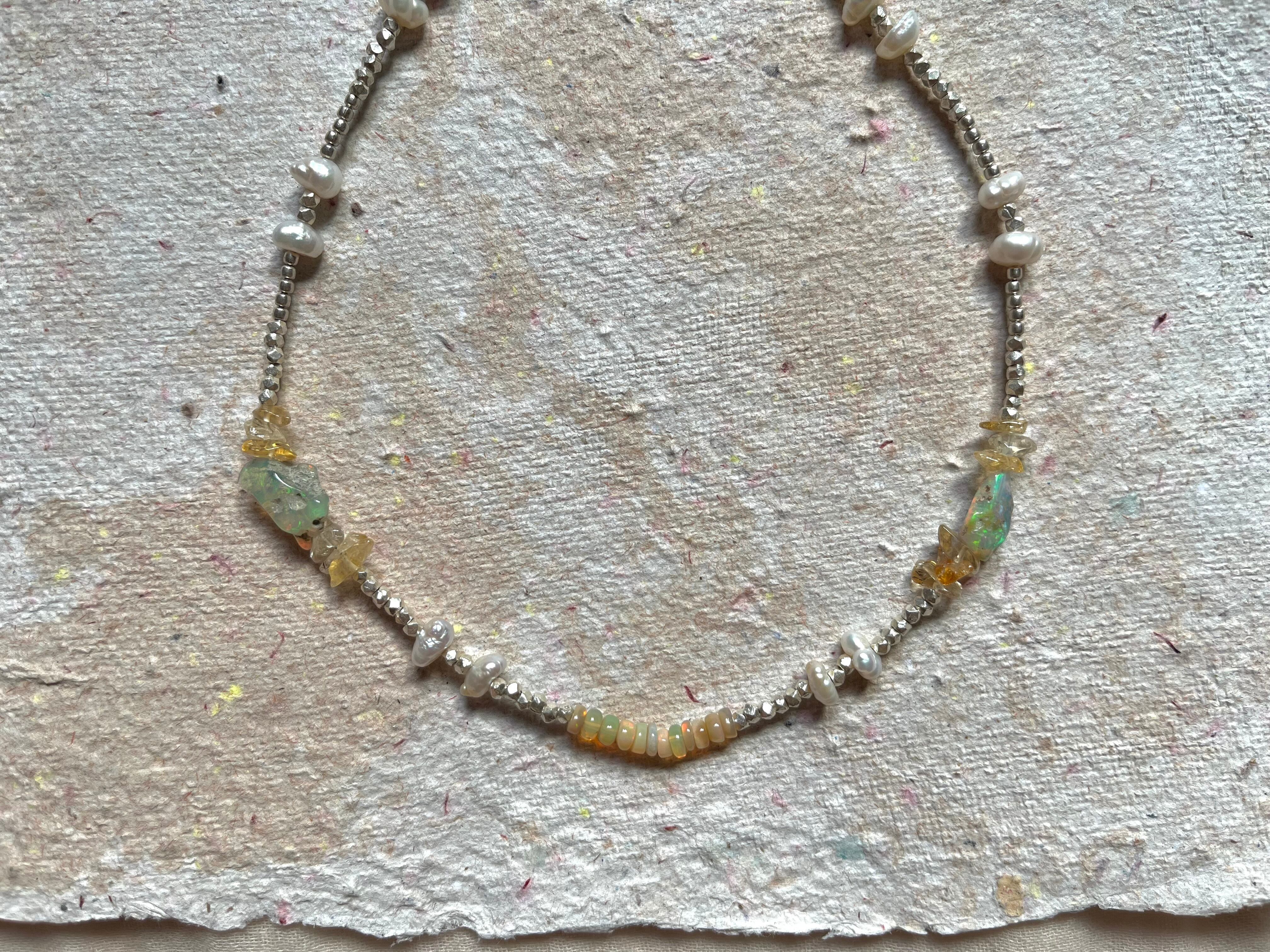 キラキラのオパールと、パール(真珠)、シトリンクォーツ、サイドには母岩付きのrawオパールを。ハンドメイドのシルバービーズと組み合わせて、きれいすぎないカジュアルなスタイルを。